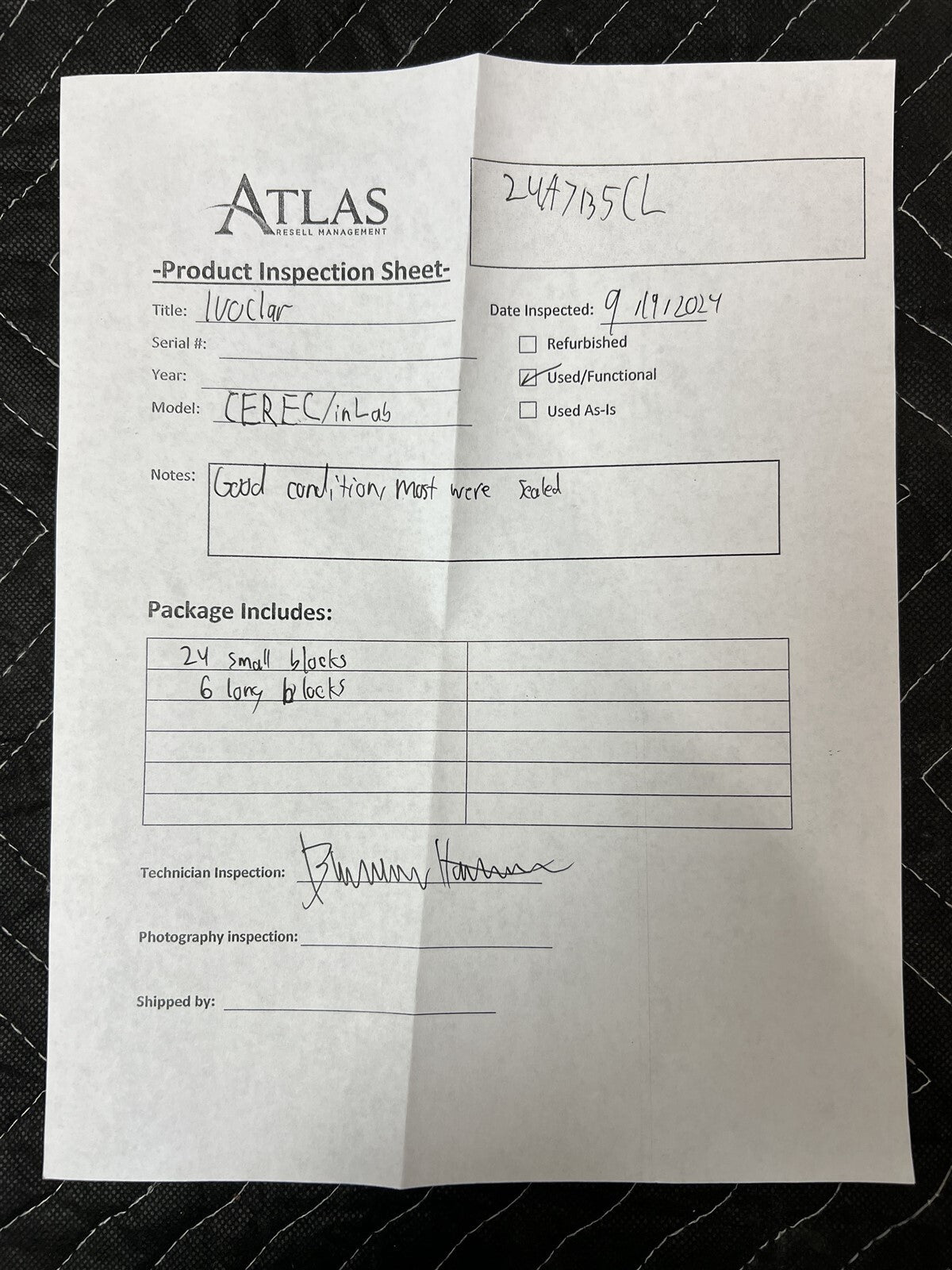 Atlas Resell Management has more experience testing and shipping CEREC and other CAD/CAM units than anyone else on eBay. Just check out the wide selection of CAD/CAM units in our store.We're proud to be the most trusted source for quality used CAD/CAM units in the pre-owned dental equipment market. Your purchase will NOT include: - other accessories not shown or listed here.Visually inspected, each block was in perfect condition, with many sealed in their box.