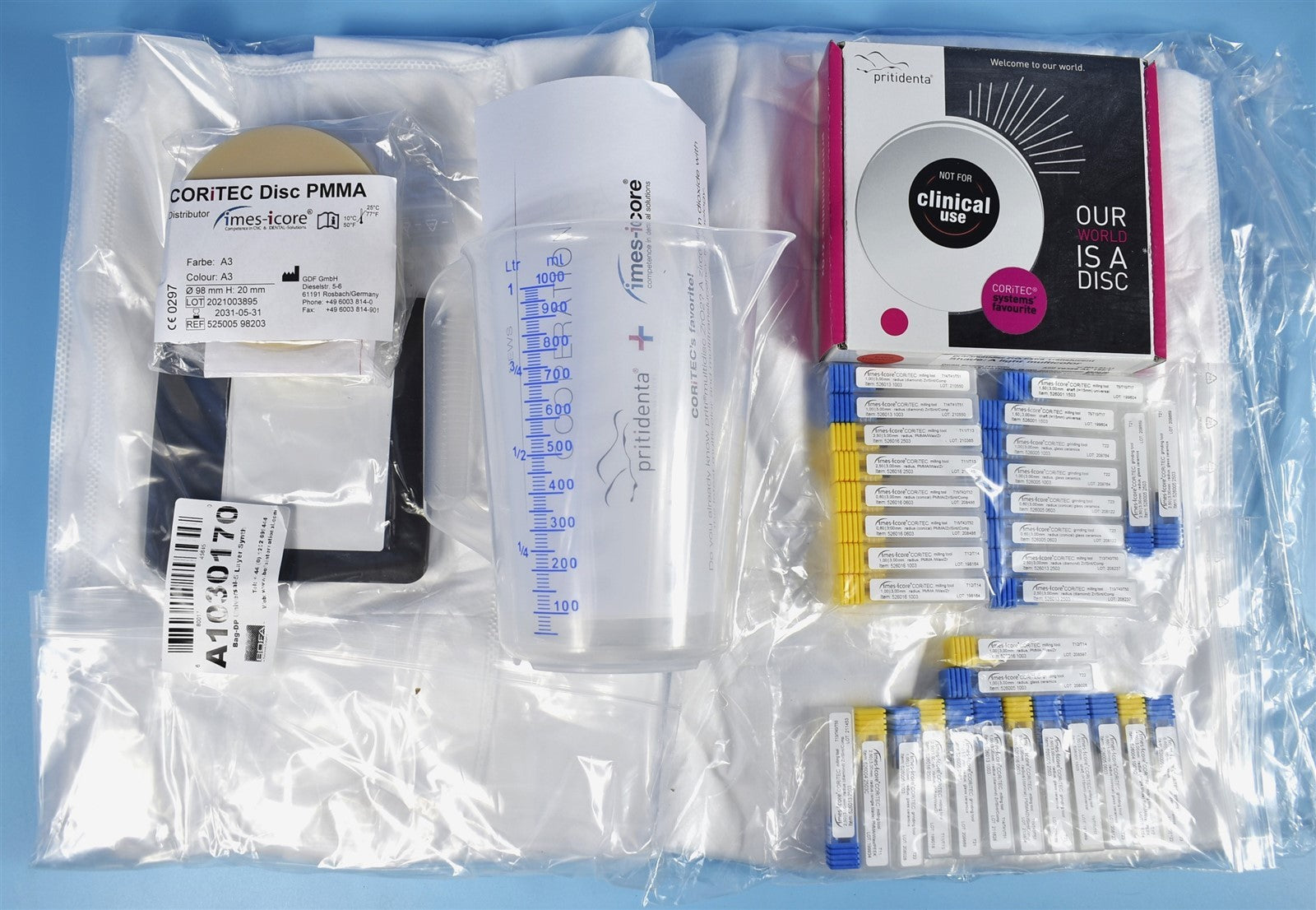 Dell 24 Monitor, Stand Base and Riser, 120V Power Cables, Displayport Cable, USB 3.0 Upstream Cable, Cable Cover, PA EURO 6mm x 8mm /7,5m, PA EURO 6mm x 8mm /5m, 50S-PCTower, PlanMill 50 S, Keyboard, CAD/CAM for labs, Coritec Mill & Grind Liquid, 3-Block Holder x2, Stylus, Kluber Lubrication, Brush, Mouse, Ethernet, Various Burr Tips, Milling Discs, Filters, Vacuum Unit, Vacuum Hose