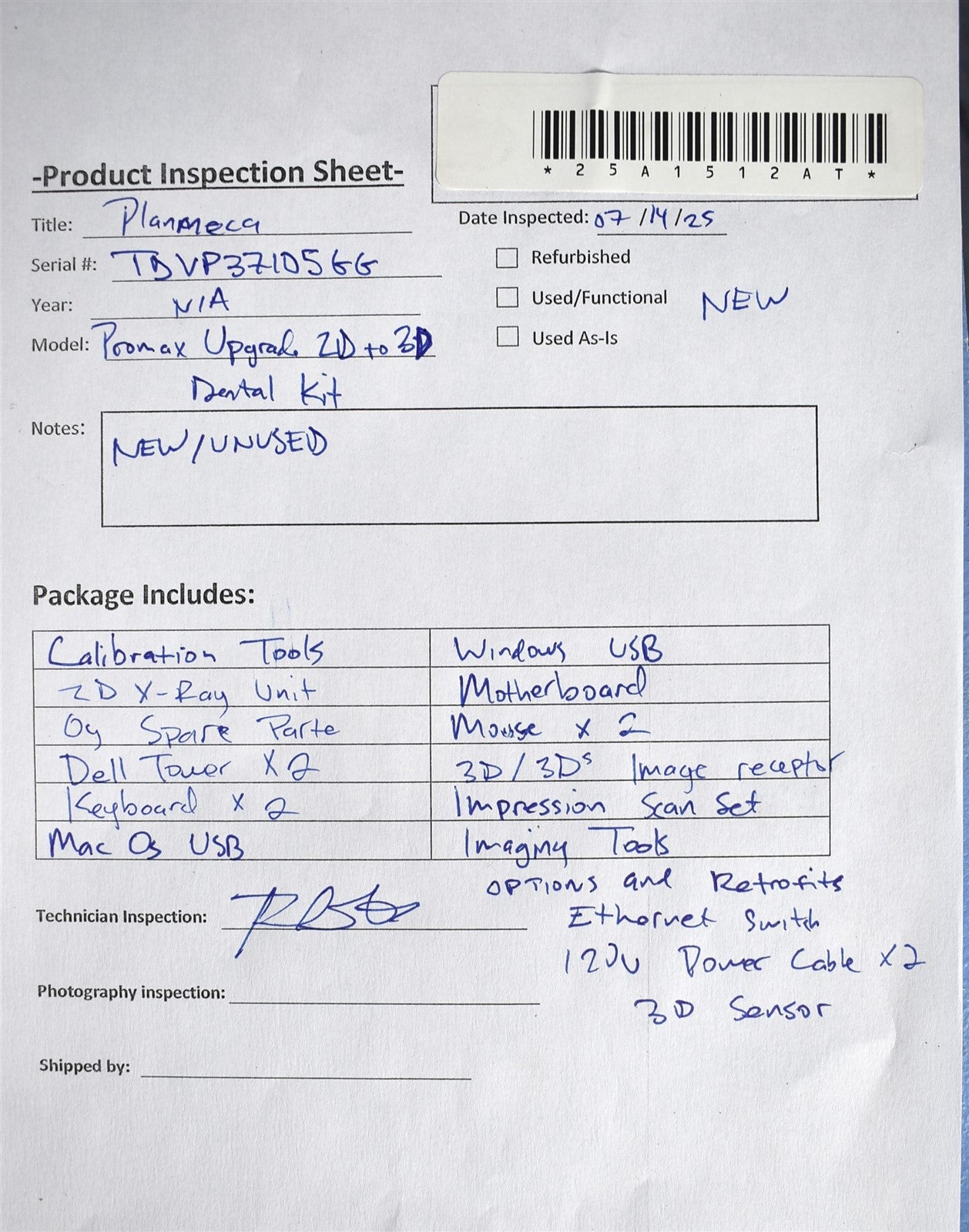 Calibration Tools, 2D X-Ray Unit, Oy Spare Parte, Dell Tower x2, Keyboard x2, Mac OS USB, Windows USB, Motherboard, Mouse x2, 3D/3Ds Image receptor, Impression Scan Set, Imaging Tools, Options and Retrofits, Ethernet Switch, 120v Power Cable x2, 3D Sensor