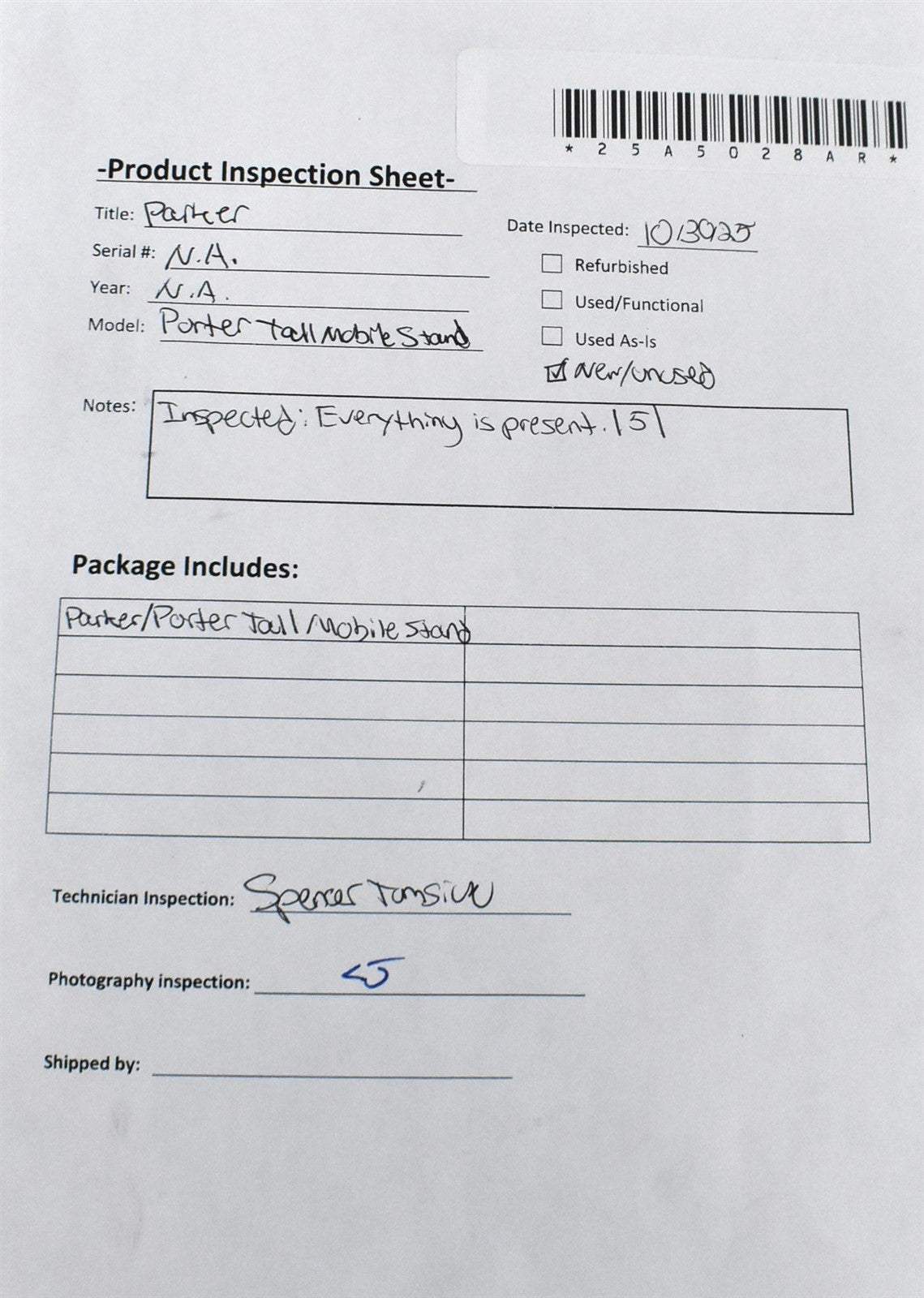 Verified that all components are present, undamaged, and document condition without powering on the unit.