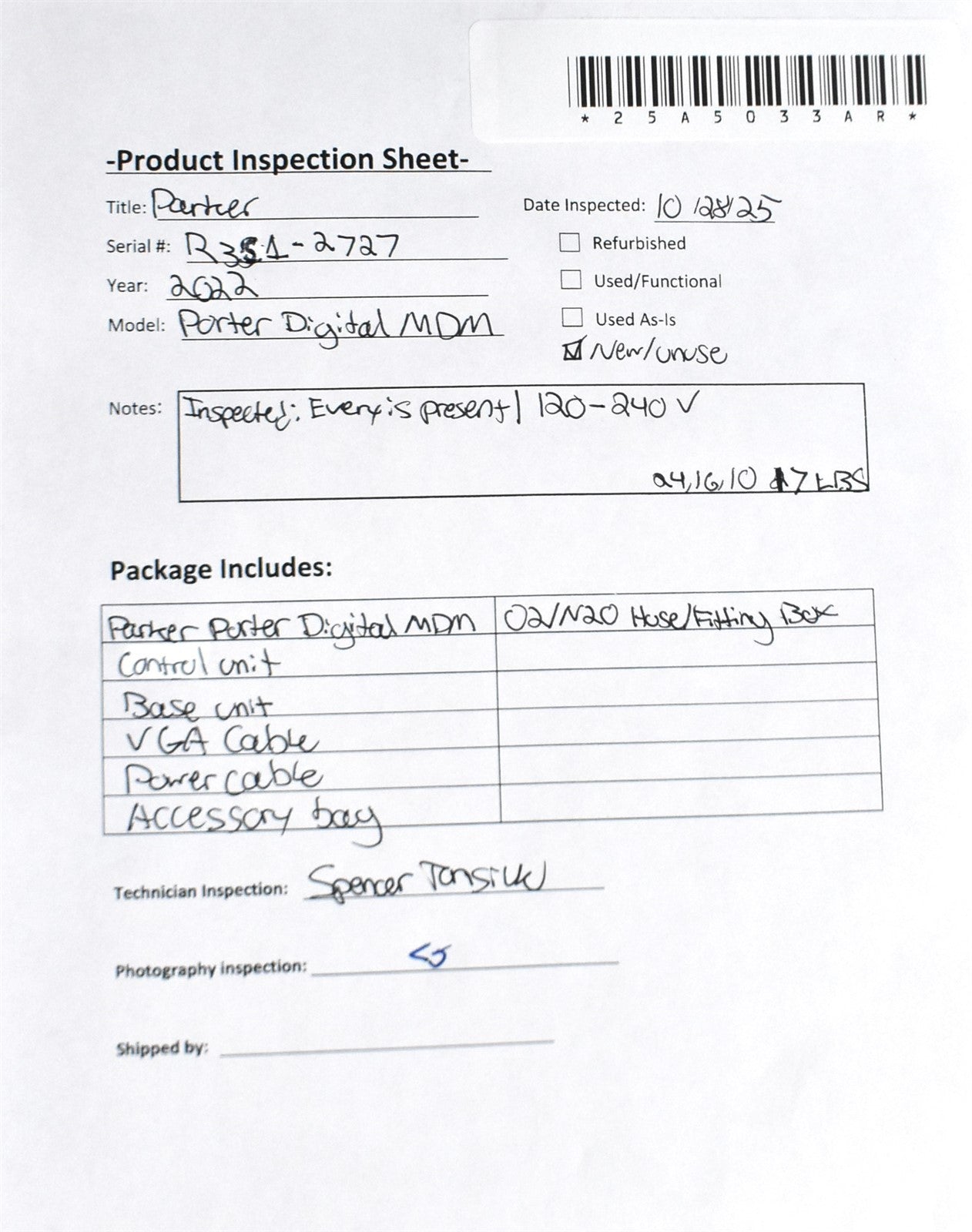 Parker/Porter Digital MDM, Base unit, Control Unit, VGA cable, Accessory Bag, O2/N20 Hose and Fitting Box