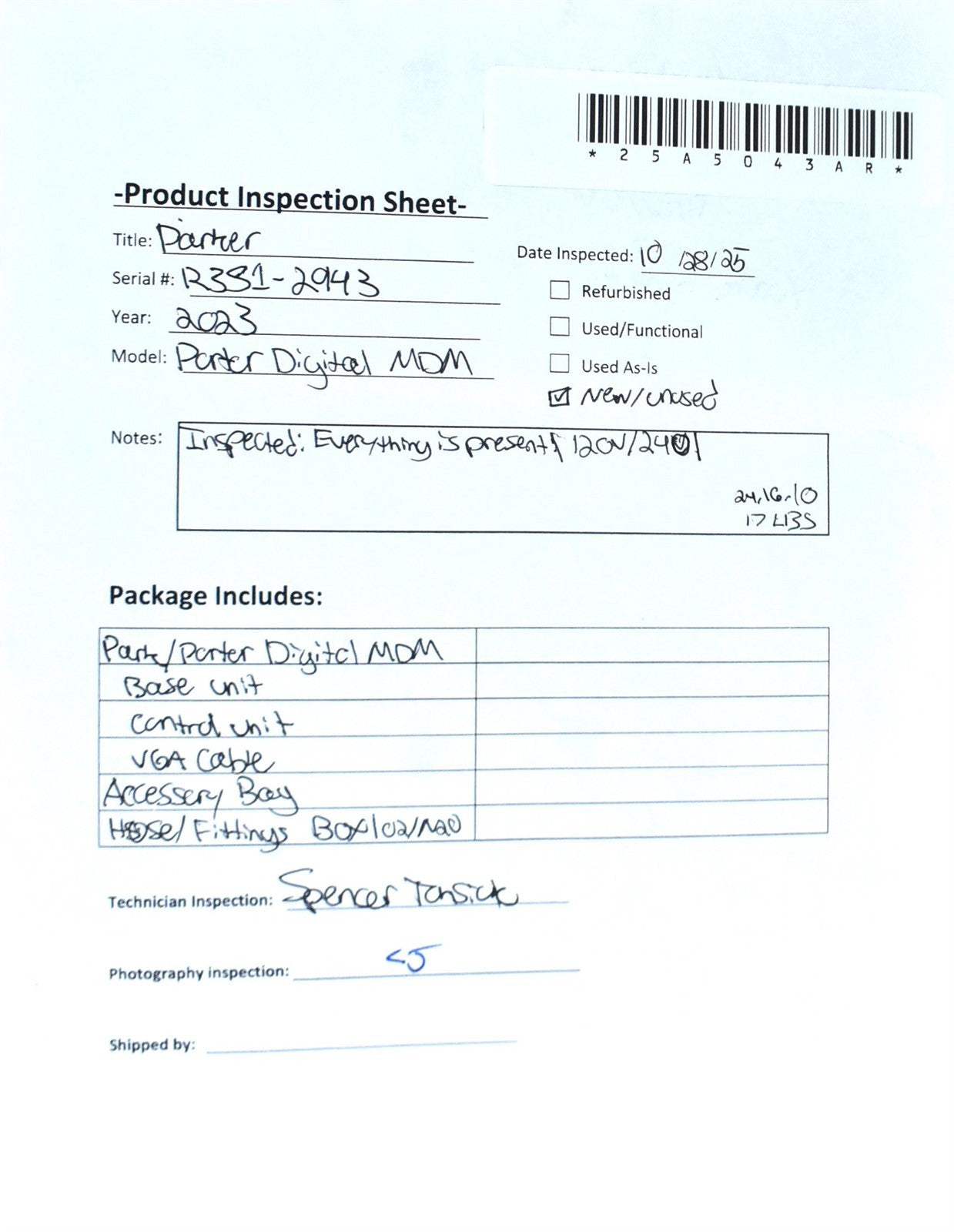 Parker/Porter Digital MDM, Base unit, Control Unit, VGA cable, Accessory Bag, O2/N20 Hose and Fitting Box