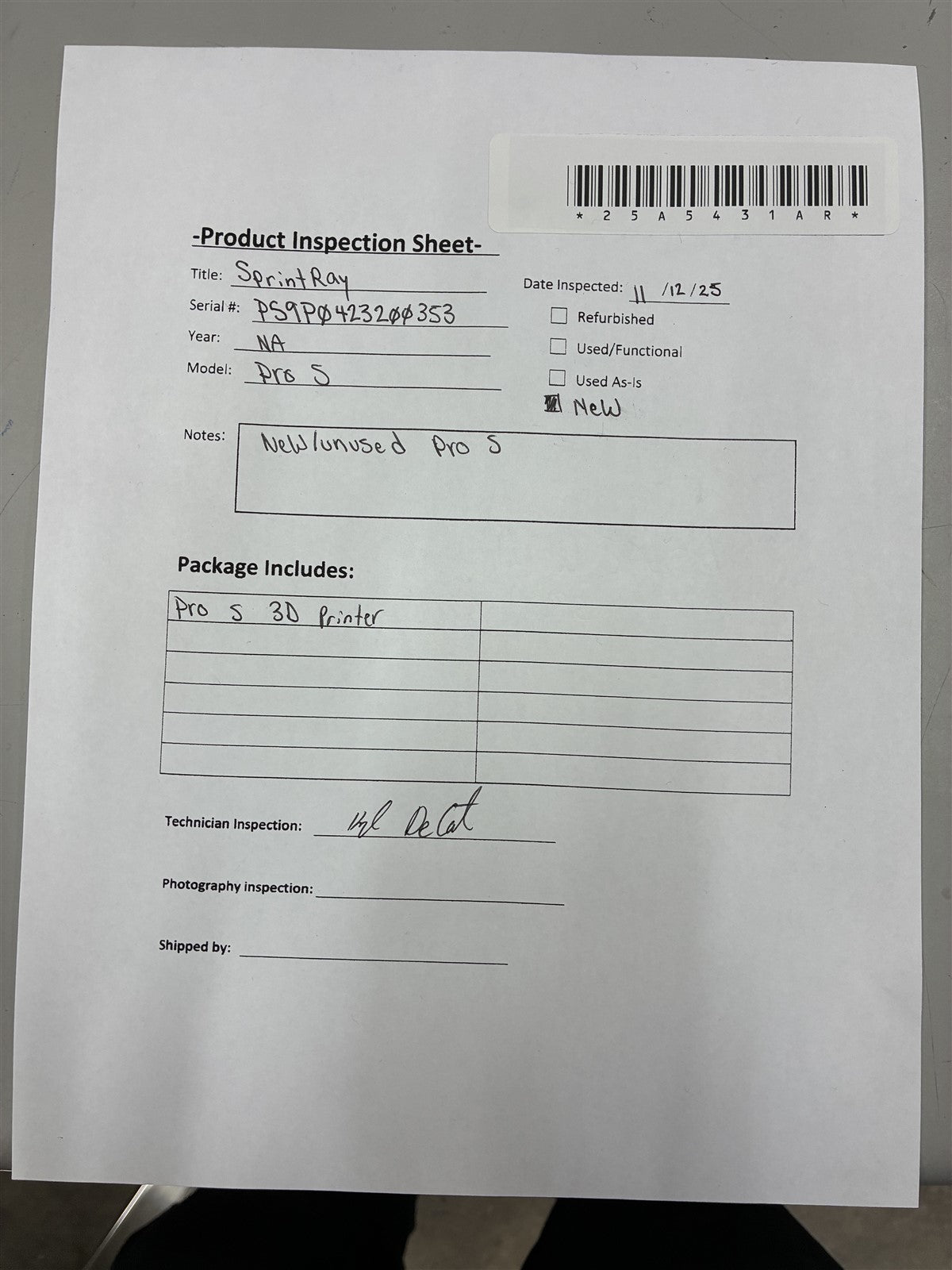 Your purchase will NOT include: - other accessories not shown or listed here.NEW/UNUSED SprintRay Pro S 3D Printer. Visually inspected for any damage or missing components. Unit is in original manufacture packaging, no damage and complete