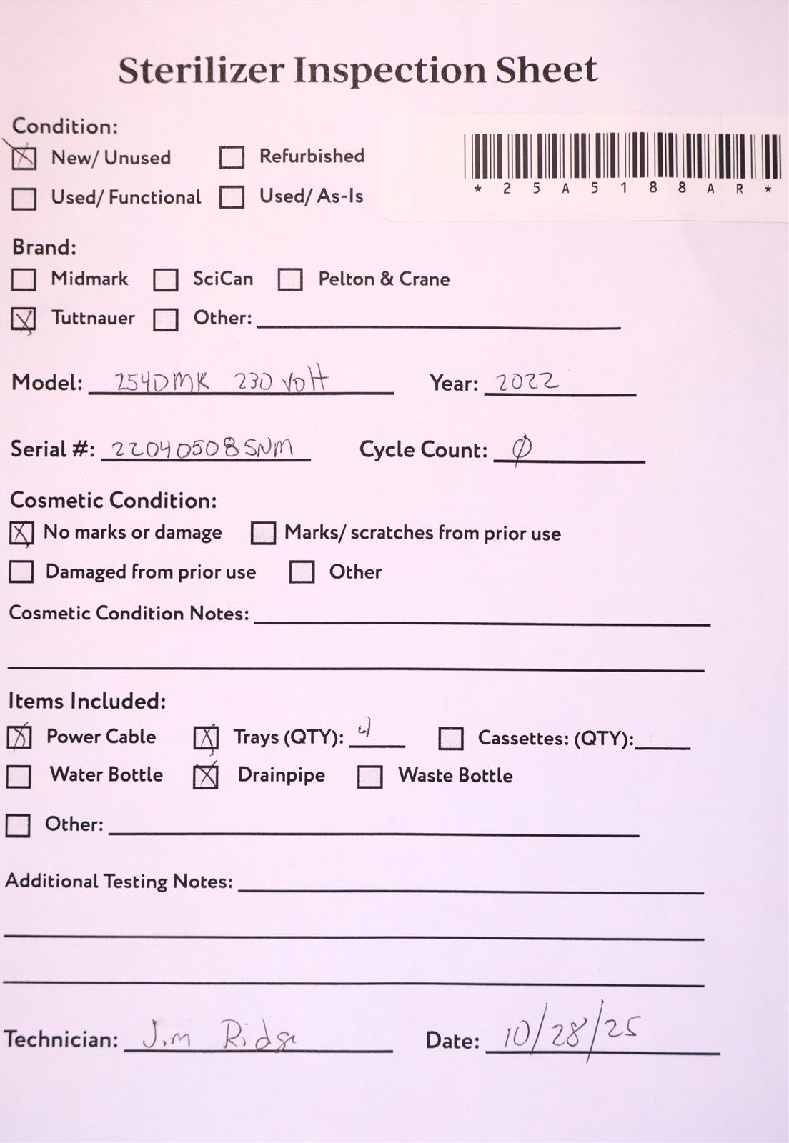 1 - Tuttnauer 2540MK 230 Volt Sterilizer 4 - Sterilizing Trays w/ Rack 1 - Tray Handle 1 - Drain Hose 1 - 230 Volt power cord.