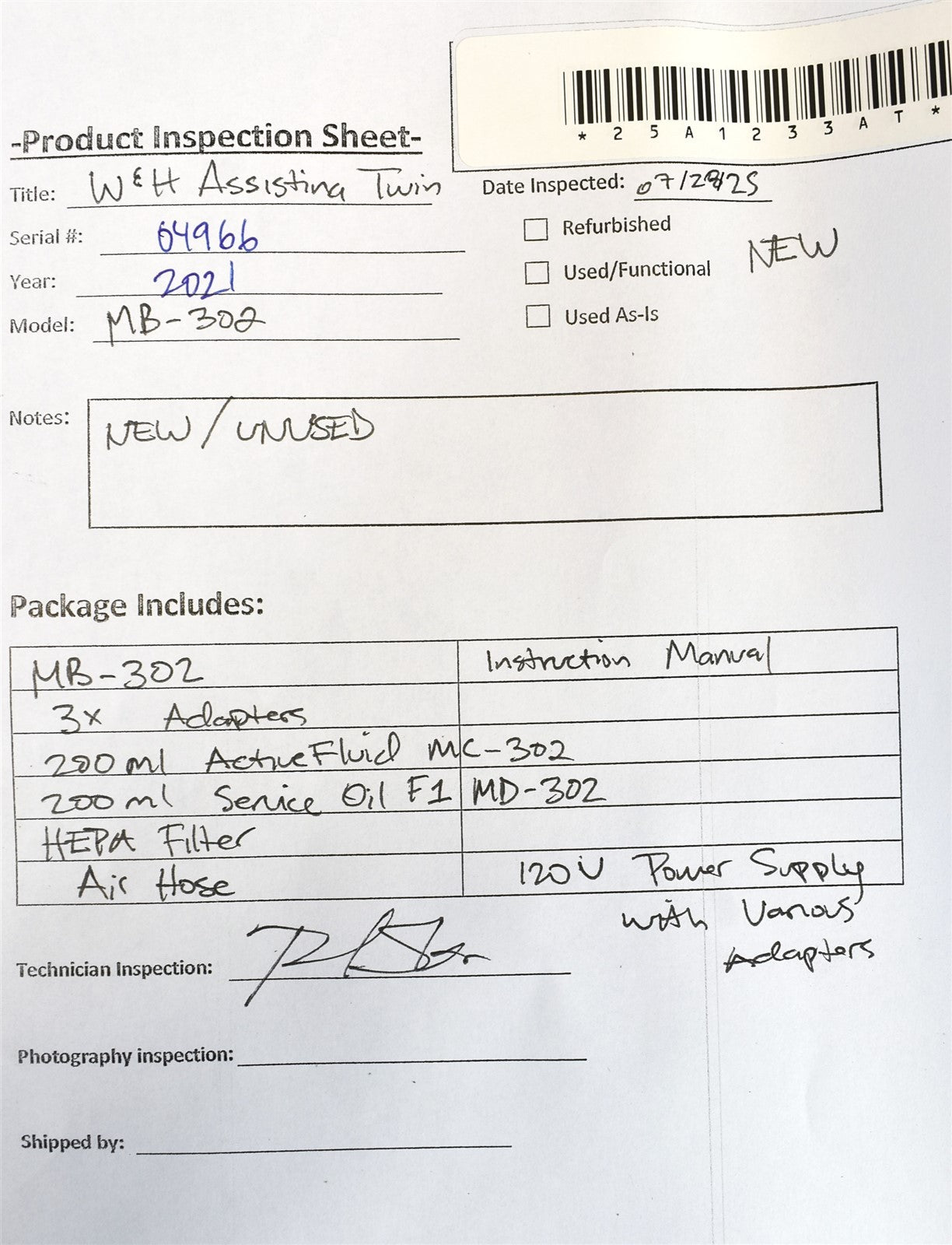 MB-302, Adapters 3x, 200ml ActiveFluid MC-302, 200ml Service Oil F1 MD-302, HEPA Filter, Air Hose, 120V Power Supply w/ various adapters, Instruction Manual