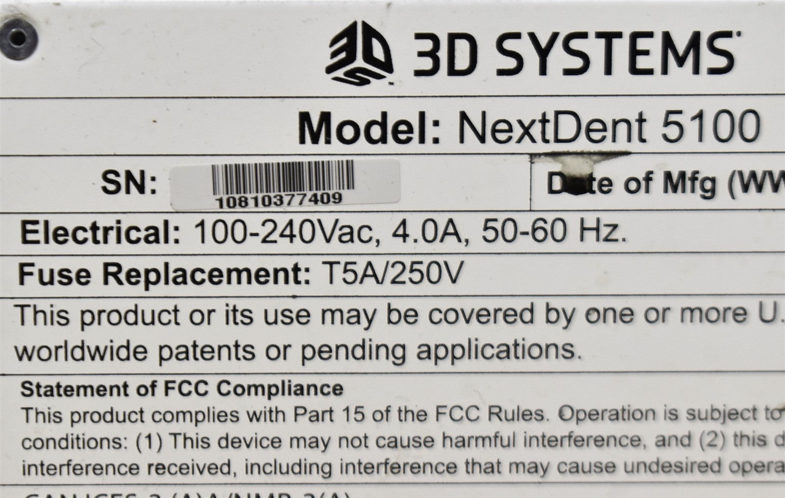 Your purchase will NOT include:This product is pre-owned and may not include the same accessories as a new, unused unit. - other accessories not shown or listed here. NextDent 5100 3D Printer for dental applications High-speed, high-precision DLP 3D printing technology Compatible with a wide range of NextDent biocompatible resins Large build volume for crowns, bridges, dentures, and orthodontic models Easy-to-use software with intuitive workflow and print management Reliable and consistent print quality for professional dental labs Fast print times for increased productivity Compact and durable design for modern dental practice or lab Supports multiple types of dental restorations and appliances Trusted by dental professionals worldwide for accuracy and performancePowered on both Units, 120 volt. Checked over Units for damage and defects. Both display screens working properly. Units have been cleaned and disinfected. Inspection Result: - Ready for Resale.