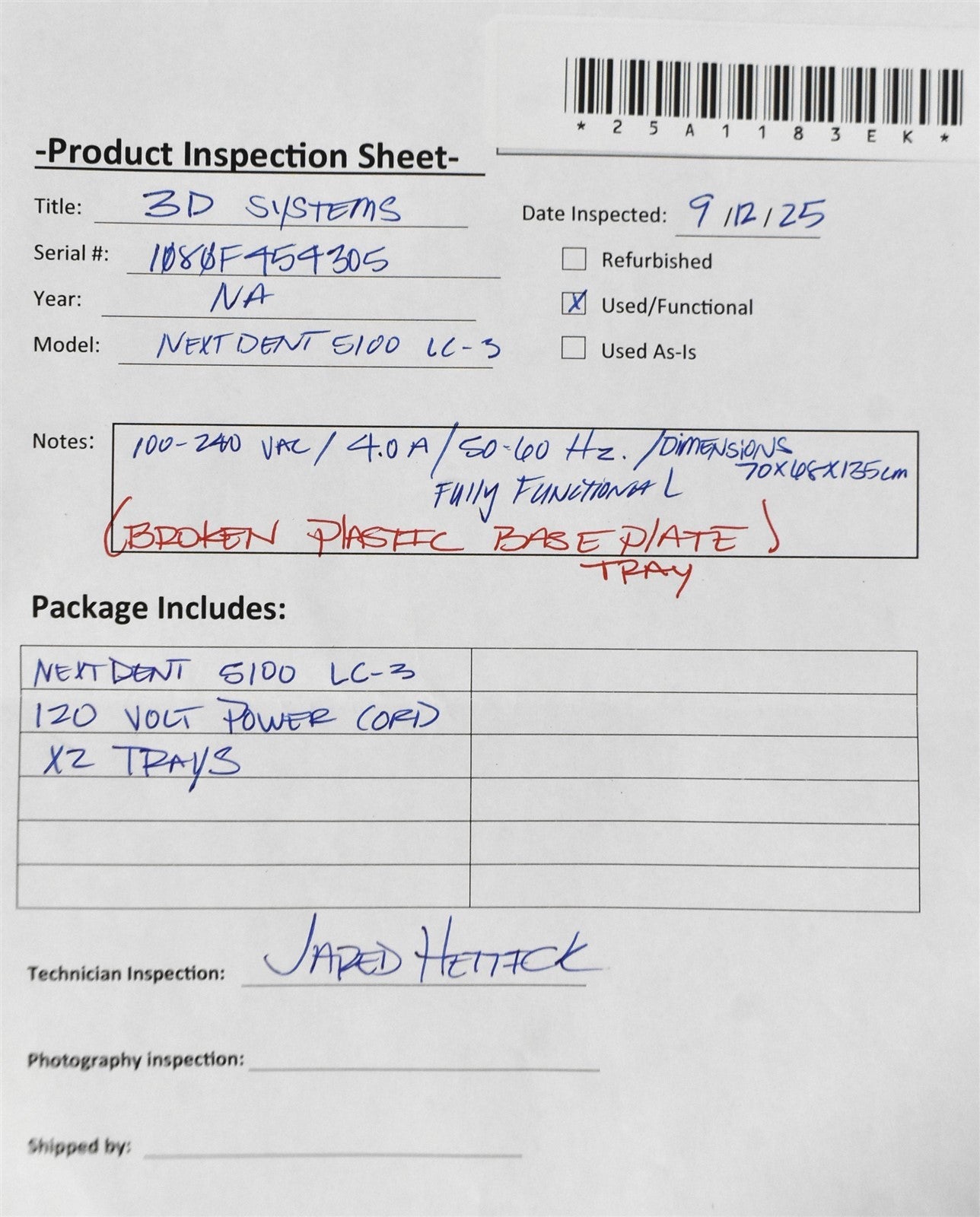 Your purchase will NOT include:This product is pre-owned and may not include the same accessories as a new, unused unit. - other accessories not shown or listed here.NextDent 5100 and LC-3DPrint Box for full functionality, you’ll want to run through a structured validation checklist that covers hardware, software, resin handling, and post-processing. Confirm firmware version and 3D Sprint software compatibility. Verify Ethernet connection and IP assignment. Inspect build platform, resin tray, and catch tray for wear or residue. Full setup required to test.