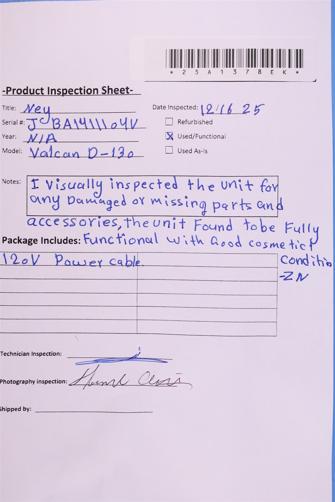 Visually inspected the unit for any damaged or missing parts and accessories. the unit found to be fully functional with good cosmetic condition. ZN