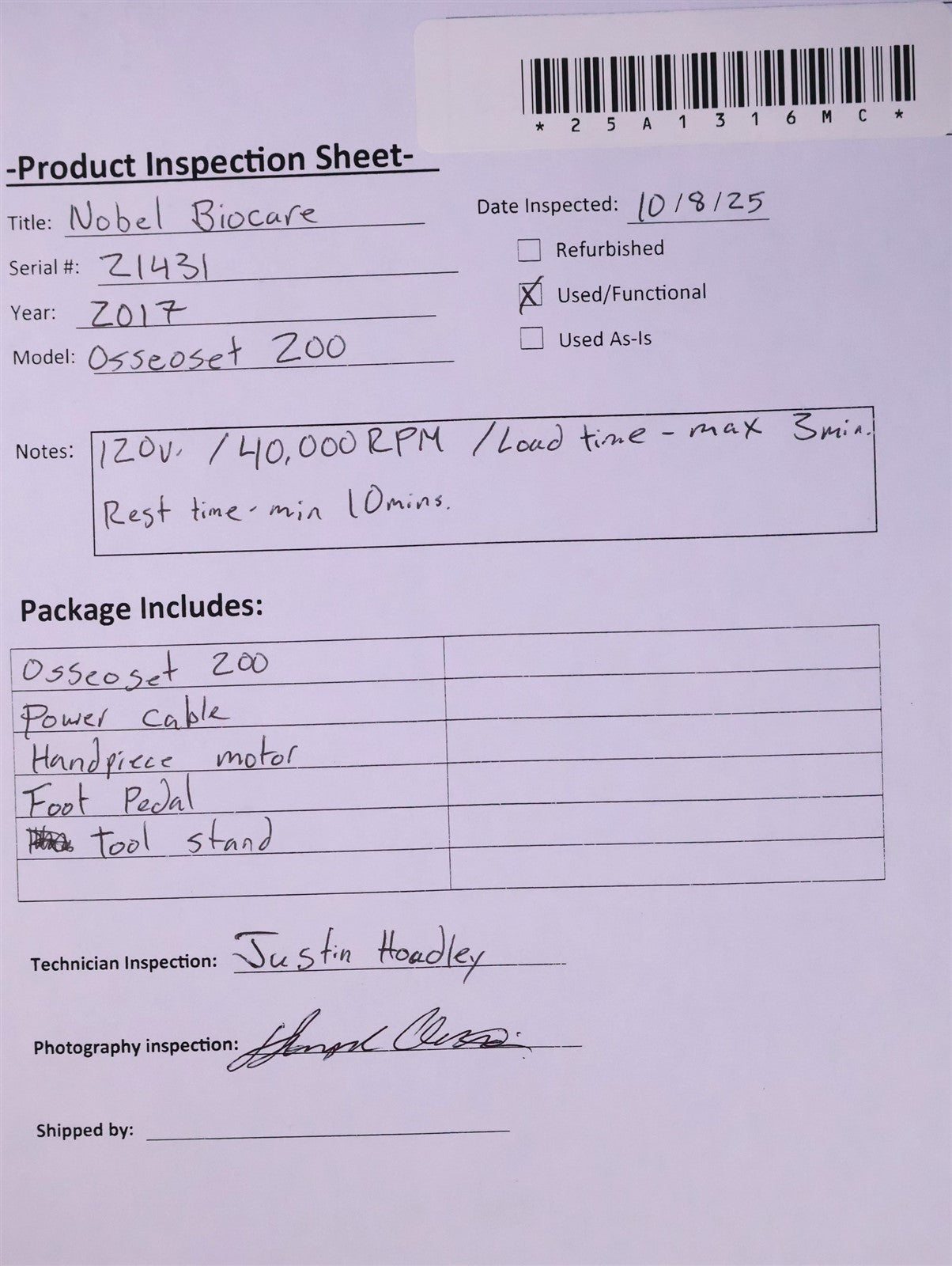 Your purchase will NOT include: Water LineThis product is pre-owned and may not include the same accessories as a new, unused unit. - other accessories not shown or listed here.The unit was powered on and underwent a comprehensive functionality assessment. The display screen and control buttons were tested and confirmed to be responsive. The foot pedal, handpiece, and water dispenser motor were also evaluated and found to be operating correctly. All systems appear to be functioning as intended.
