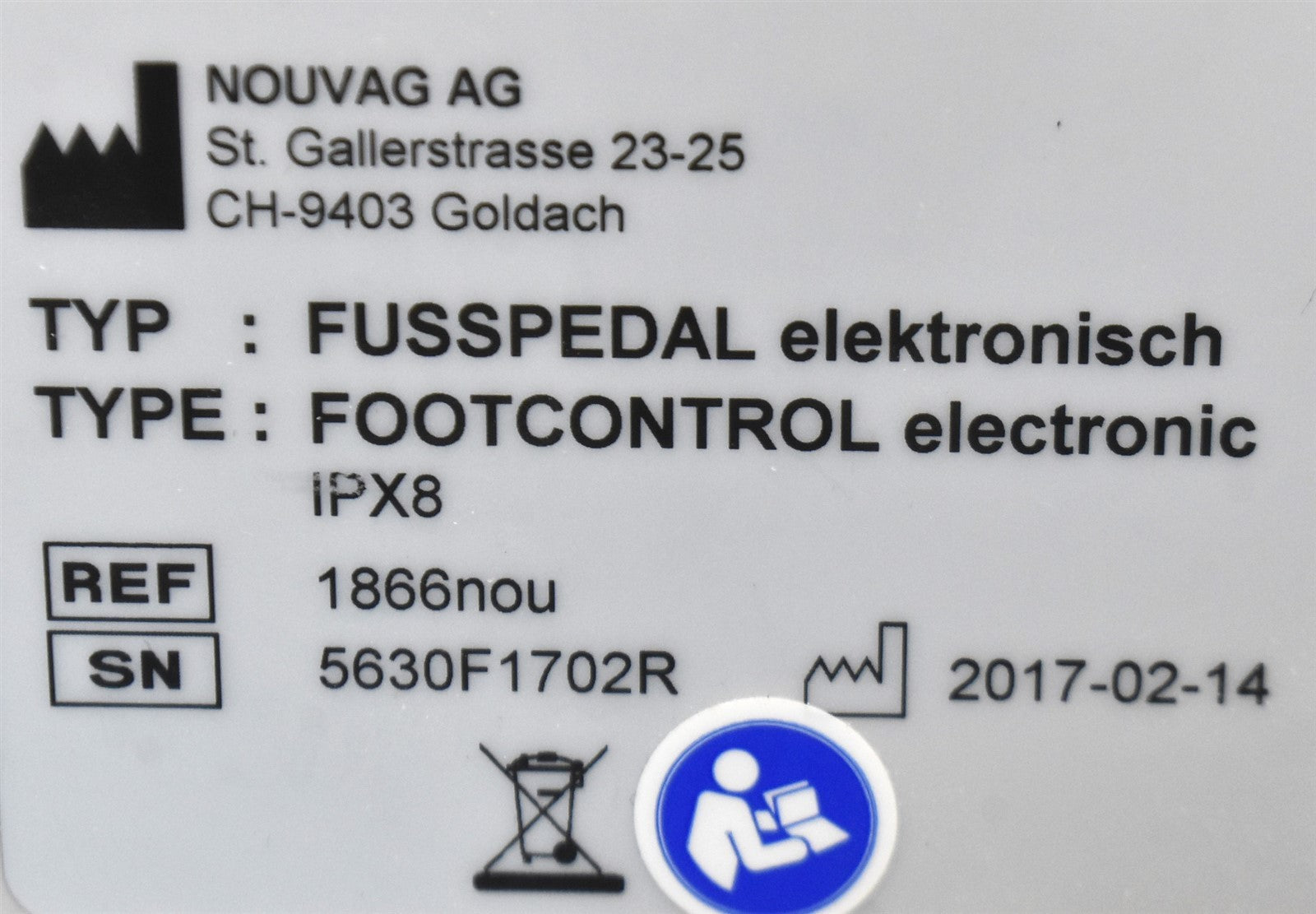 Nouvag MD11 was checked over for damage and defects. Display illuminates without error codes. Audible feedback from keys is present. Foot pedal responds to speed and pump commands. The unit has been cleaned and disinfected. Inspection Result: - Ready for Resale.