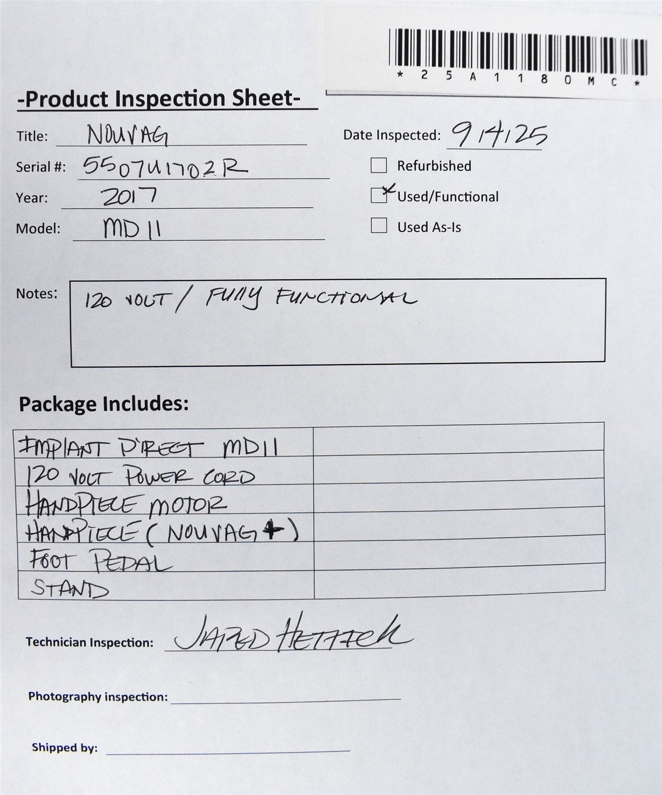 Your purchase will NOT include: This product is pre-owned and may not include the same accessories as a new, unused unit. - other accessories not shown or listed here.Nouvag MD11 was checked over for damage and defects. Display illuminates without error codes. Audible feedback from keys is present. Foot pedal responds to speed and pump commands. The unit has been cleaned and disinfected. Inspection Result: - Ready for Resale.