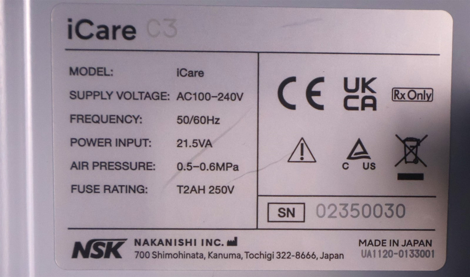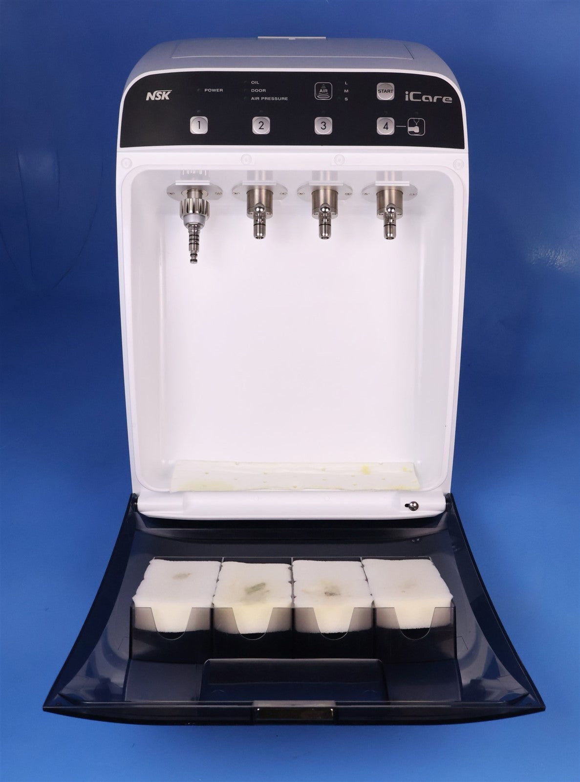 This NSK iCare C3 is a chuck lubricating machine for maintaining the handpiece longevity. All keypad functions work and respond. Burr feature also responds and functions as intended. NO LUBRICANT INCLUDED. Lubricant cap and filter and power cord included. Fully functional. FINAL INSPECTION STATUS PASSED.