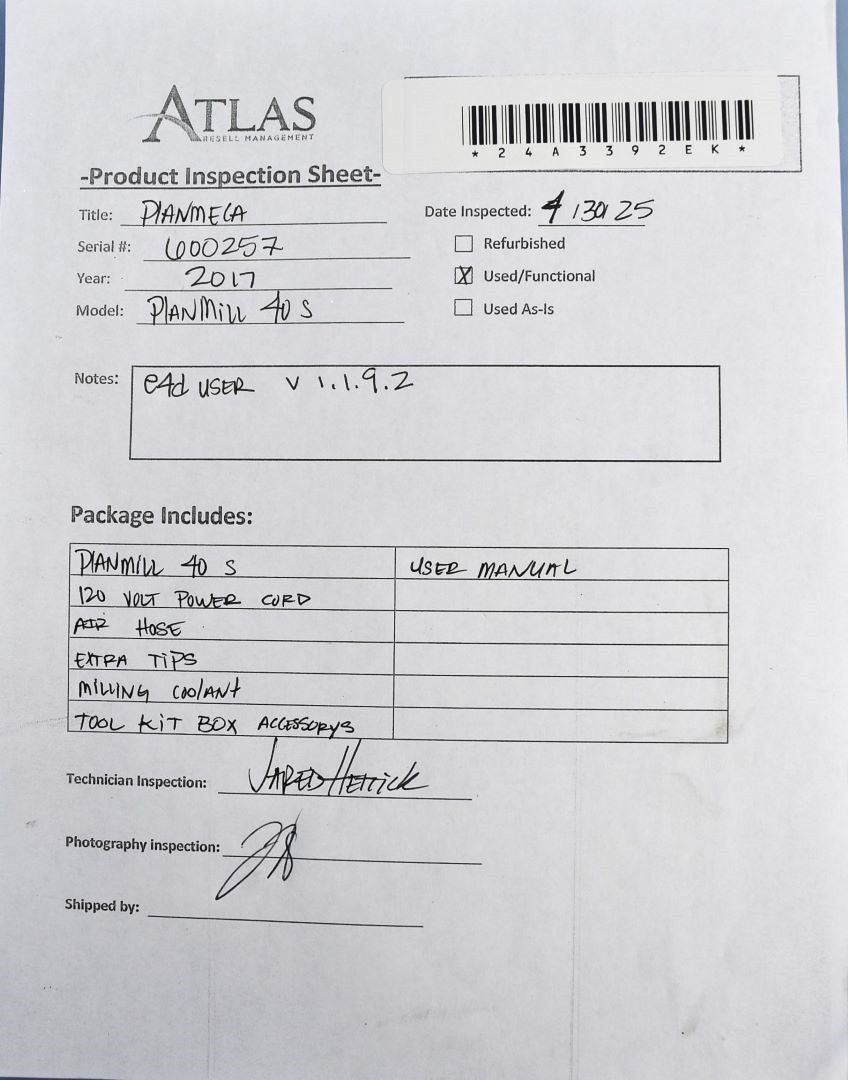 PlanMill 40 S- Was inspected for damage and defects, Powered on unit for functional test, connections to air were established with no Air leak. Display screen fully functional.Unit needs Job Server. Unit was disinfected and cleaned. Inspection Results-Pass, Ready for resale.