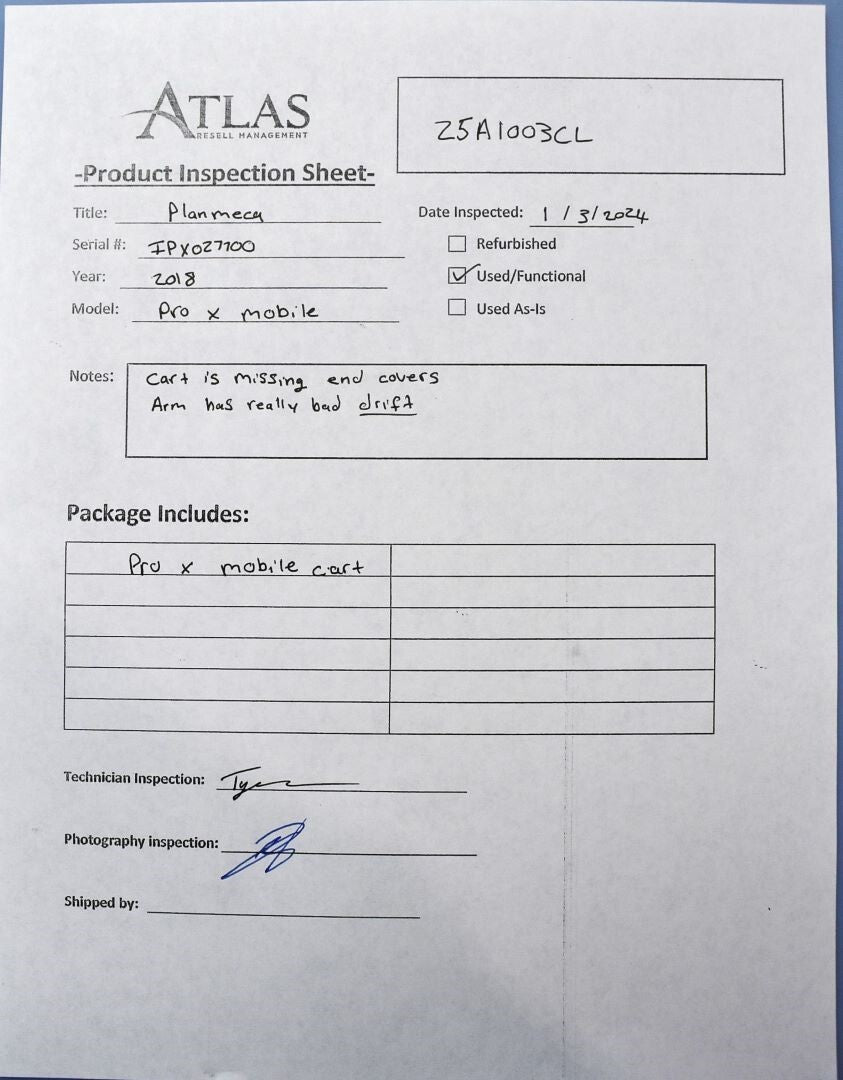 Your purchase will NOT include: This product is pre-owned and may not include the same accessories as a new, unused unit. - other accessories not shown or listed here.Plugged this item into power and shot on a variety of exposure lengths without issues. Cosmetically this item is in fair condition, it has some marks around the base of the cart from being bumped into things and it has some tape residue on the control box. This X-Ray in particular has an issue with drift right where the arms go into the cart.