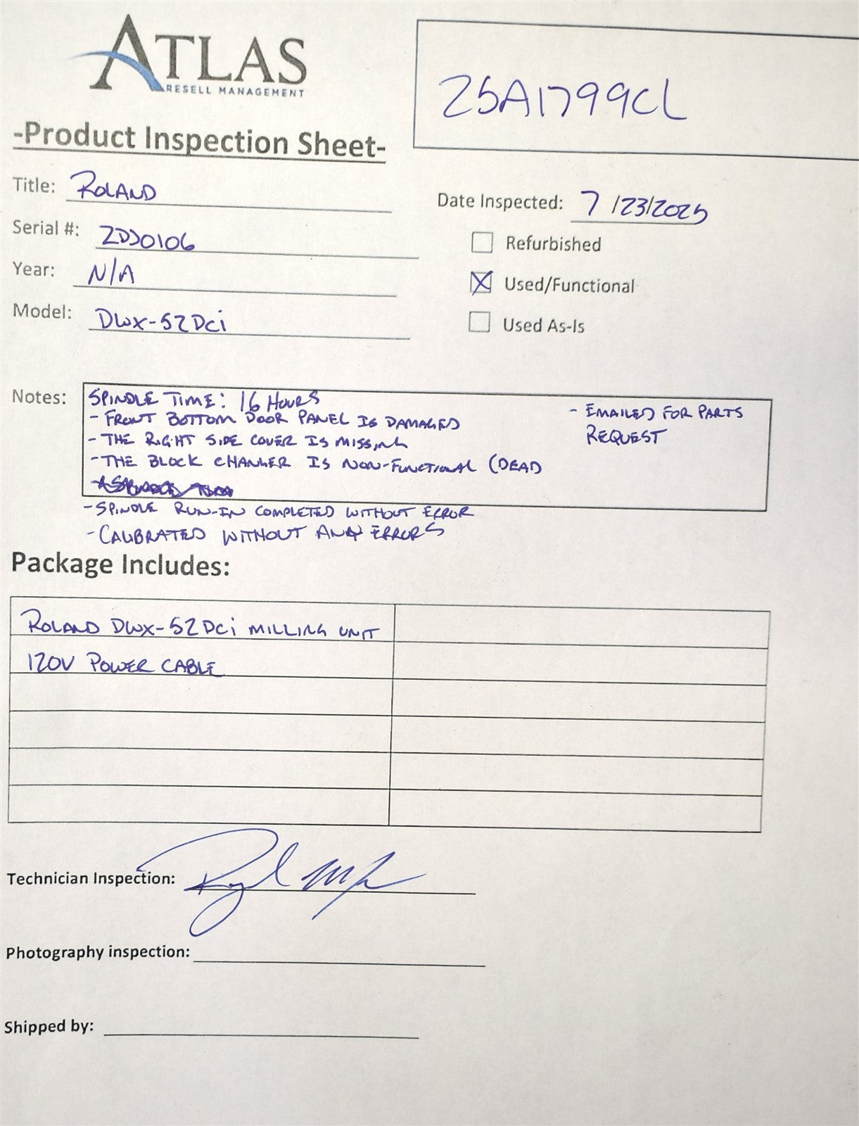 Atlas Resell Management has more experience testing and shipping CEREC and other CAD/CAM units than anyone else on eBay. Just check out the wide selection of CAD/CAM units in our store.We're proud to be the most trusted source for quality used CAD/CAM units in the pre-owned dental equipment market. Your purchase will NOT include:Software, DriverThis product is pre-owned and may not include the same accessories as a new, unused unit. - other accessories not shown or listed here.Visually inspected the unit for any damaged or missing parts and accessories. The front label on the bottom drawer is damaged. Connected the unit to a computer. Ran the spindle run-in and it completed without any errors. Calibrated the unit. The unit calibrated successfully. This unit is fully functional. Contacted DGShape for a quote on the price for the missing panel and damaged front cover.