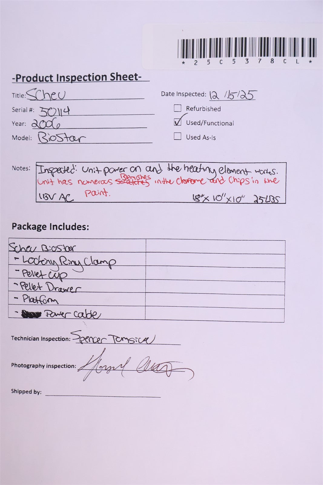 Shue Biostar, Locking Ring Clamp, Pellet Cup, Pellet Drawer, Platform, power cable