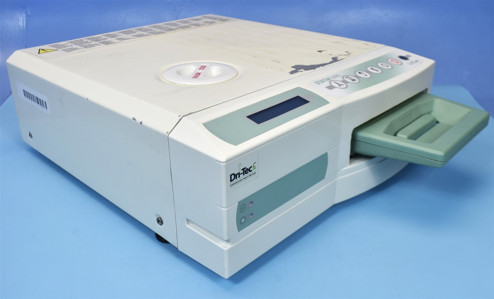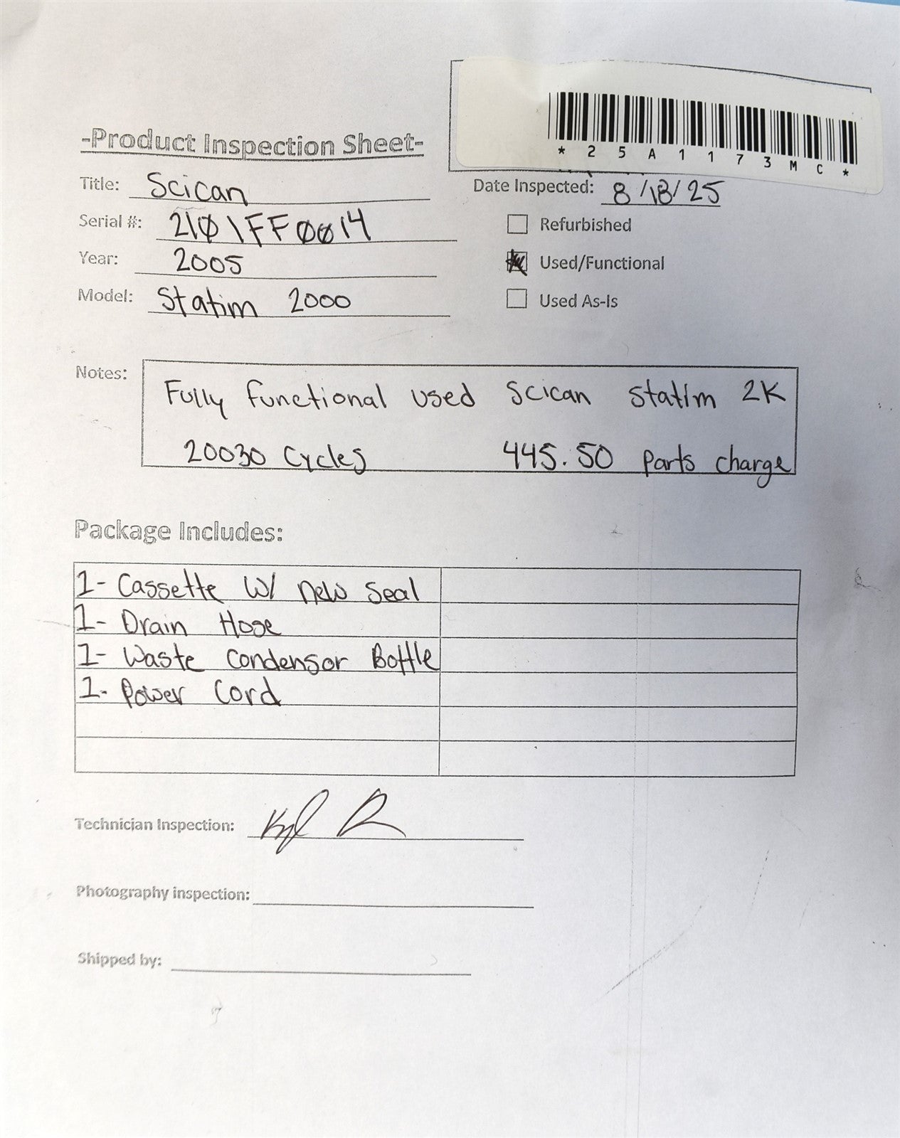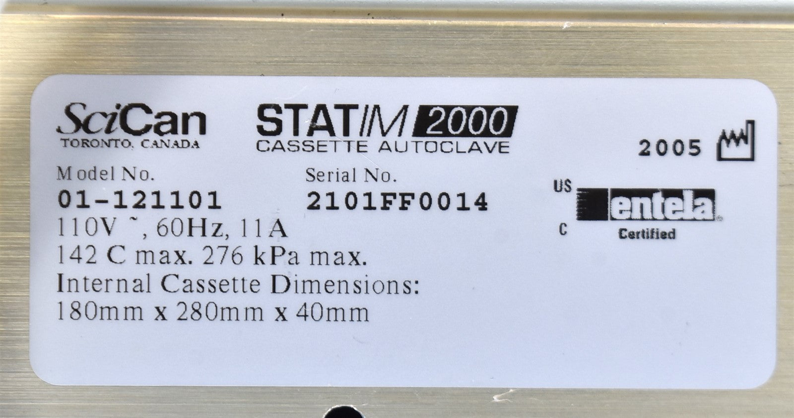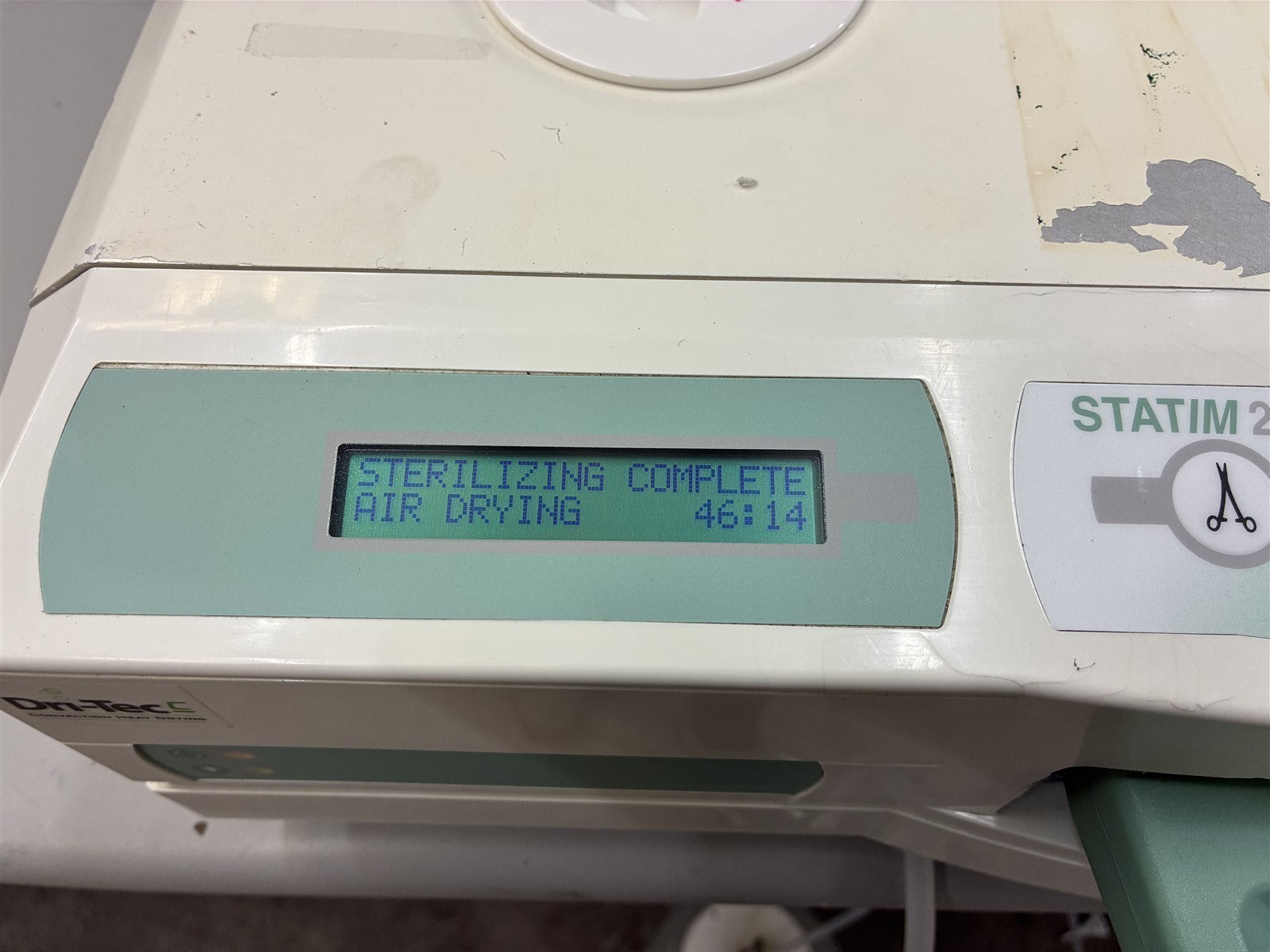 Your purchase will NOT include: This product is pre-owned and may not include the same accessories as a new, unused unit. - other accessories not shown or listed here. Model: STATIM 2000 Autoclave Manufacturer: SciCan Fast sterilization cycle for increased operatory efficiency Compact tabletop design ideal for dental offices Automatic drying cycle for ready-to-use instruments Digital control panel for simple operation and monitoring Reliable and durable construction for long-term use Maintenance reminders and safety features built-inThis autoclave was put through an initial functionality test, to prove that it does indeed work. Once it was proven to operate correctly, it was disassembled down to it's bare chassis and cleaned up, then reassembled. To insure it continued future operation, preventive maintenance parts were installed, which include, a new Water Pump, Air Valve, Check Valve, Safety Valve, Compressor Air Filter and Biological Filter. The Reservoir Tank was cleaned and flushed and a new Reservoir Cap, Reservoir Filter and Water Pump and Drain Kit Upgrade was installed. The sterilizing cassette was also cleaned and a new Cassette Seal was installed. Prior to running test cycles on this sterilizer, the temperature sensors were calibrated. Then this autoclave was tested through all it's preset sterilizing and drying cycles multiple times. To verify that this unit is achieving it's highest maximum required sterilization temperature, it was tested using a Max Register Thermometer and found to exceed 273 F while running a sterilization cycle.
