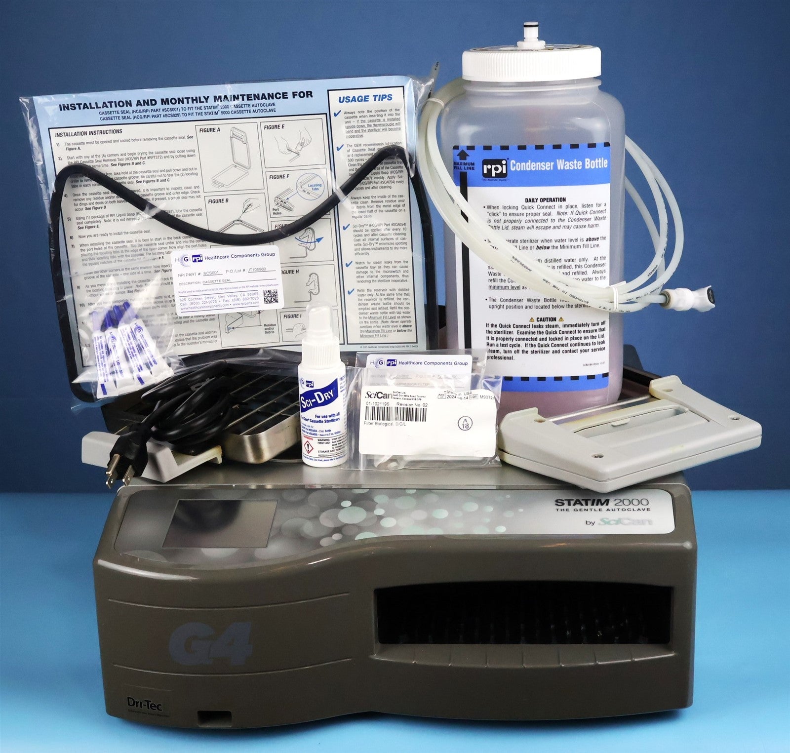 1 - SciCan STATIM 2000 G4 Cassette Autoclave 1 - Sterilizing Cassette w/ Rack 1 - Condenser Waste Bottle 1 - PM KIT 1 - Power Cord 1 - Shipping Container