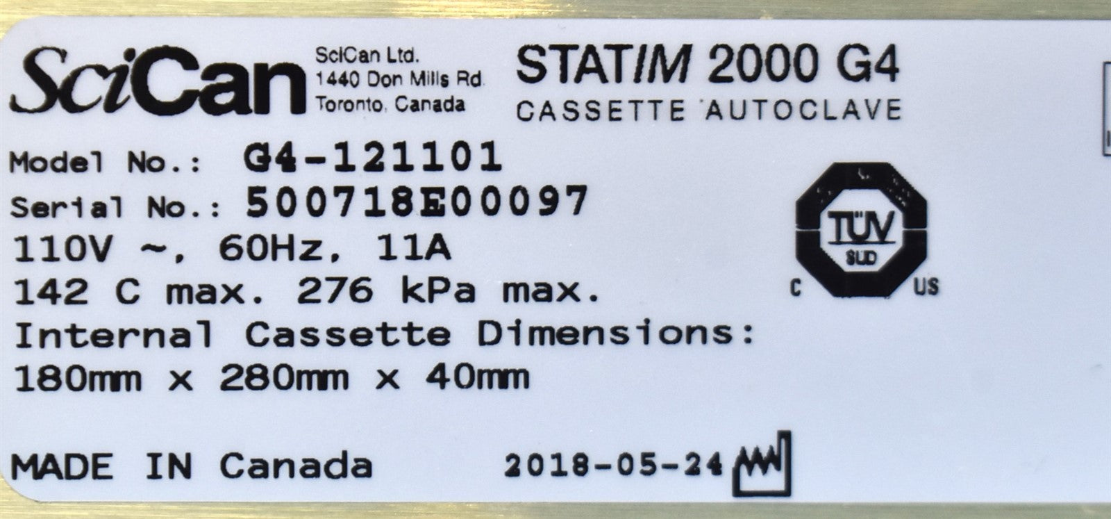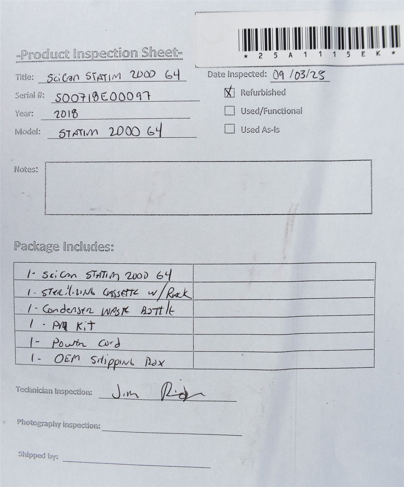 1 - SciCan STATIM 2000 G4 Cassette Autoclave 1 - Sterilizing Cassette w/ Rack 1 - Condenser Waste Bottle 1 - Power Cord 1 - OEM Shipping Container