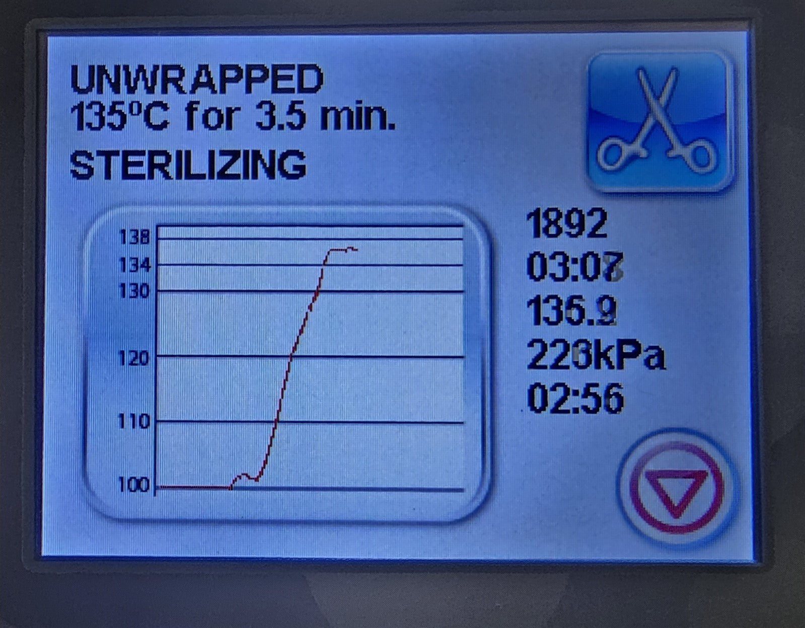 This autoclave was put through an initial functionality test, to prove that it does indeed work. Once it was proven to operate correctly, it was then connected to the internet via it's own built in Wi-Fi connection, and a new feature update was successfully installed. Then this sterilizer was disassembled down to it's bare chassis, cleaned, refurbished and reassembled. As part of this autoclaves refurbishment, preventive maintenance parts were installed, which include, a new Air Valve, Check Valve, Biological Filter and Compressor Air Filter. The Reservoir Tank was cleaned and flushed and a new Reservoir Cap, Reservoir Filter and Water Pump Filter were installed. A new Display and Keypad were installed. The sterilizing cassette was also cleaned and a new Cassette Seal was installed. Prior to running test cycles on this sterilizer, the temperature sensors were calibrated. Then this autoclave was tested through all it's preset sterilizing and drying cycles multiple times. To verify that this unit is achieving it's highest maximum required sterilization temperature, it was tested using a Max Register Thermometer and found to exceed 273 F while running a sterilization cycle.
