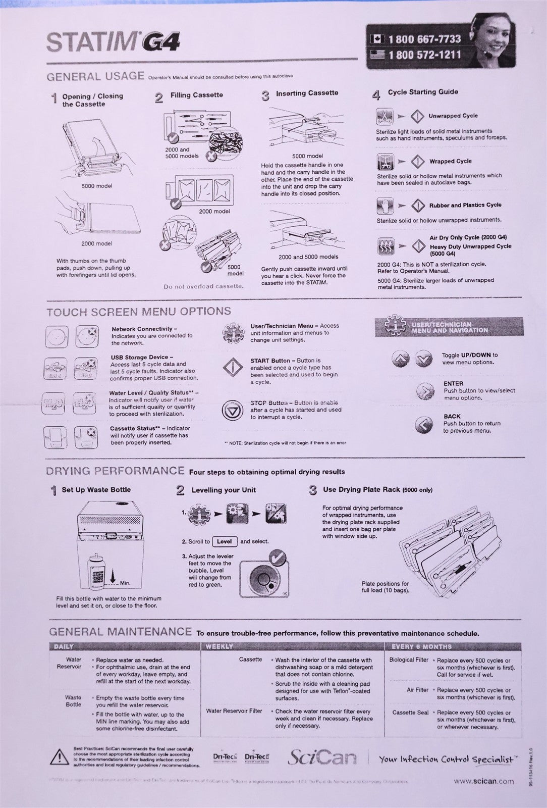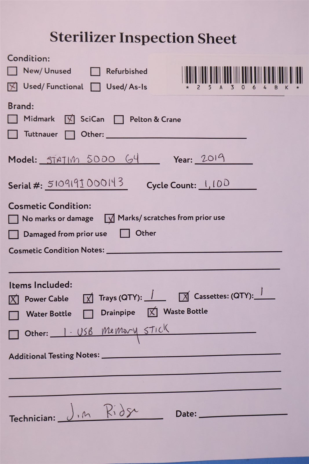 1 - SciCan STATIM 5000 G4 Cassette Autoclave 1 - Sterilizing Cassette w/ Rack 1 - Condenser Waste Bottle 1 - USB Memory Stick 1 - Power Cord