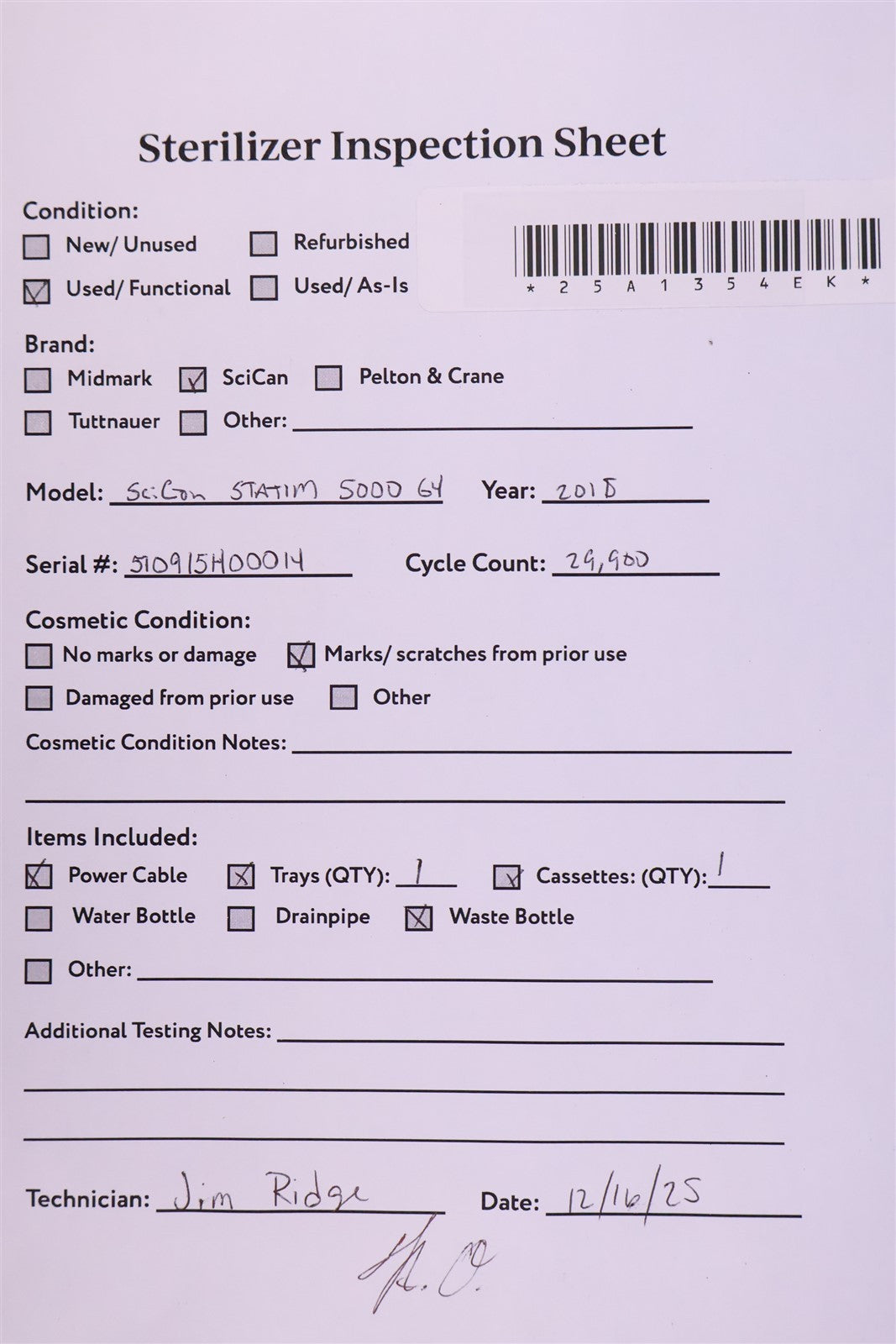 1 - SciCan STATIM 5000 G4 Cassette Autoclave 1 - Sterilizing Cassette w/ Rack 1 - Condenser Waste Bottle 1 - Power Cord