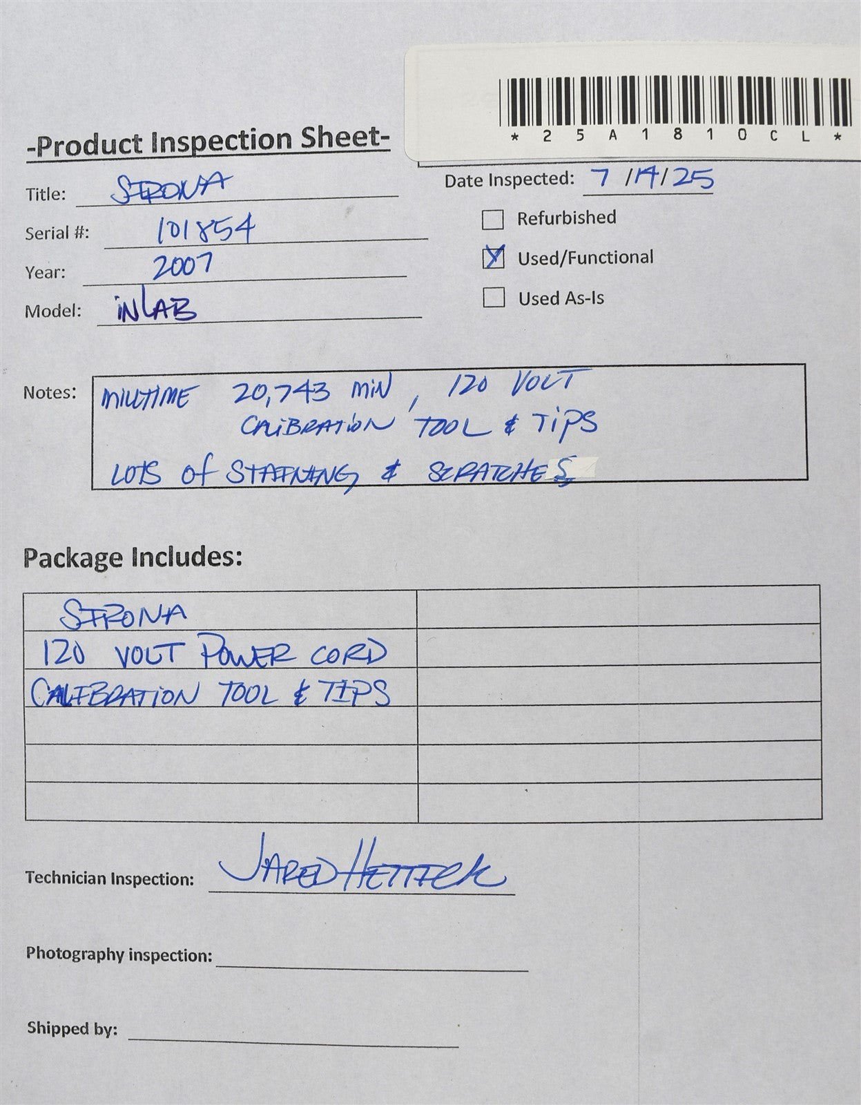 Sirona inLab MC XL milling unit Was inspected for damage and defects, . Powered on unit for functional test. Ran STEPPER test: MOVING test Calibration tested .Mouse and keyboard connected,all lights and buttons were fully functional.120volt. Inspection Result: - Ready for Resale.