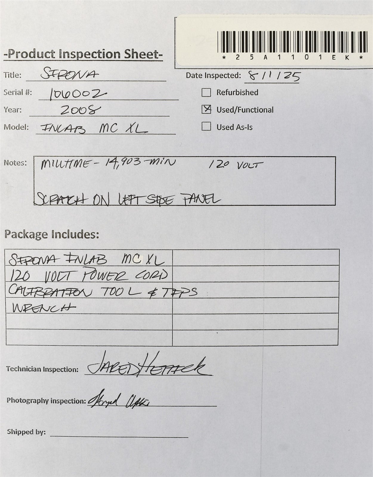 Sirona inLab MC XL milling unit Was inspected for damage and defects, . Powered on unit for functional test. Ran STEPPER test: MOVING test Calibration tested .Mouse and keyboard connected,all lights and buttons were fully functional.120volt. Inspection Result: - Ready for Resale.