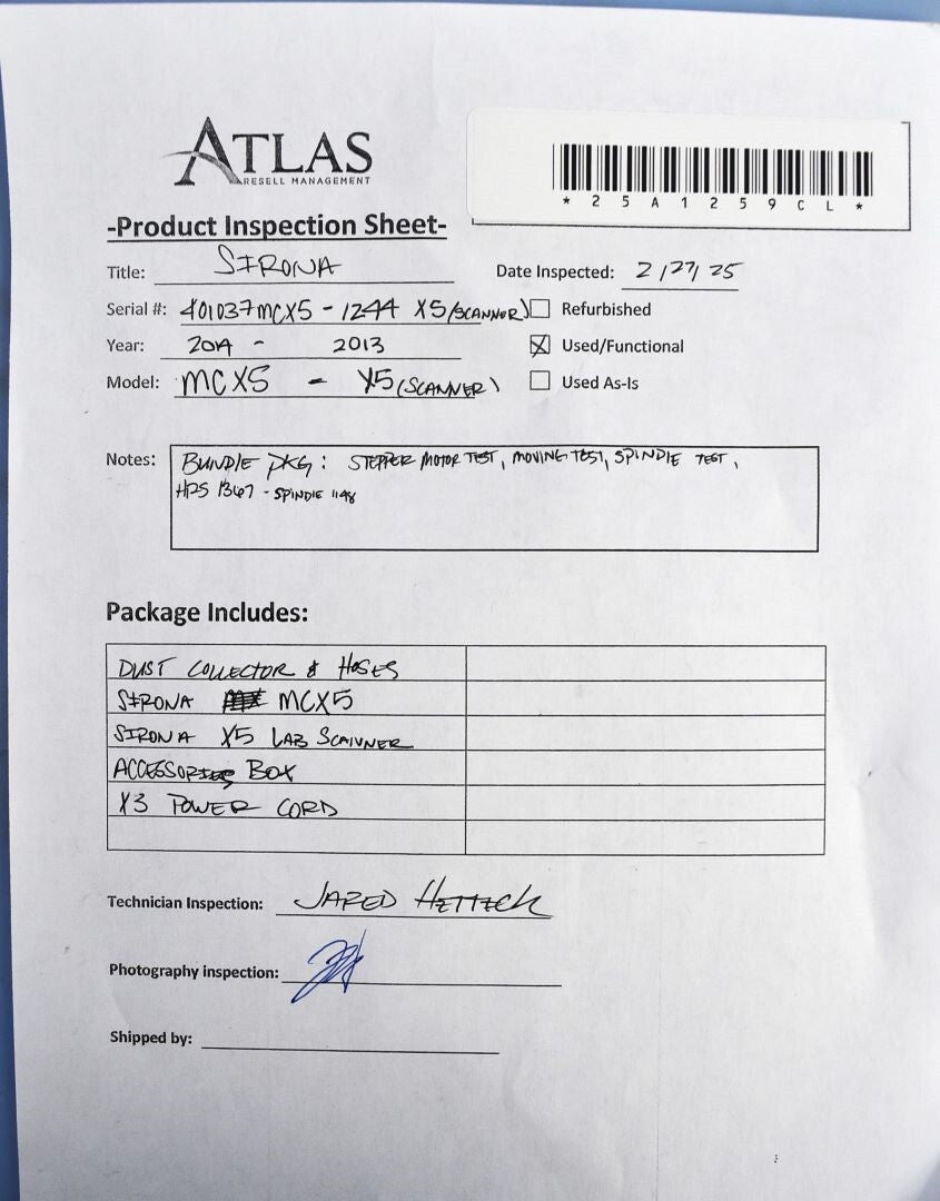 Sirona milling unit Dust collator and Lab scanner- Was inspected for damage and defects, . Powered on unit for functional test. Ran STEPPER test: MOVING test SPINDLE test : PASS. Mouse and keyboard connected,all lights and buttons were fully functional. Dust Collector has adequate suction, power knob was increased to check suction. Unit was disinfected and cleaned. Inspection Results-Pass, Ready for resale.