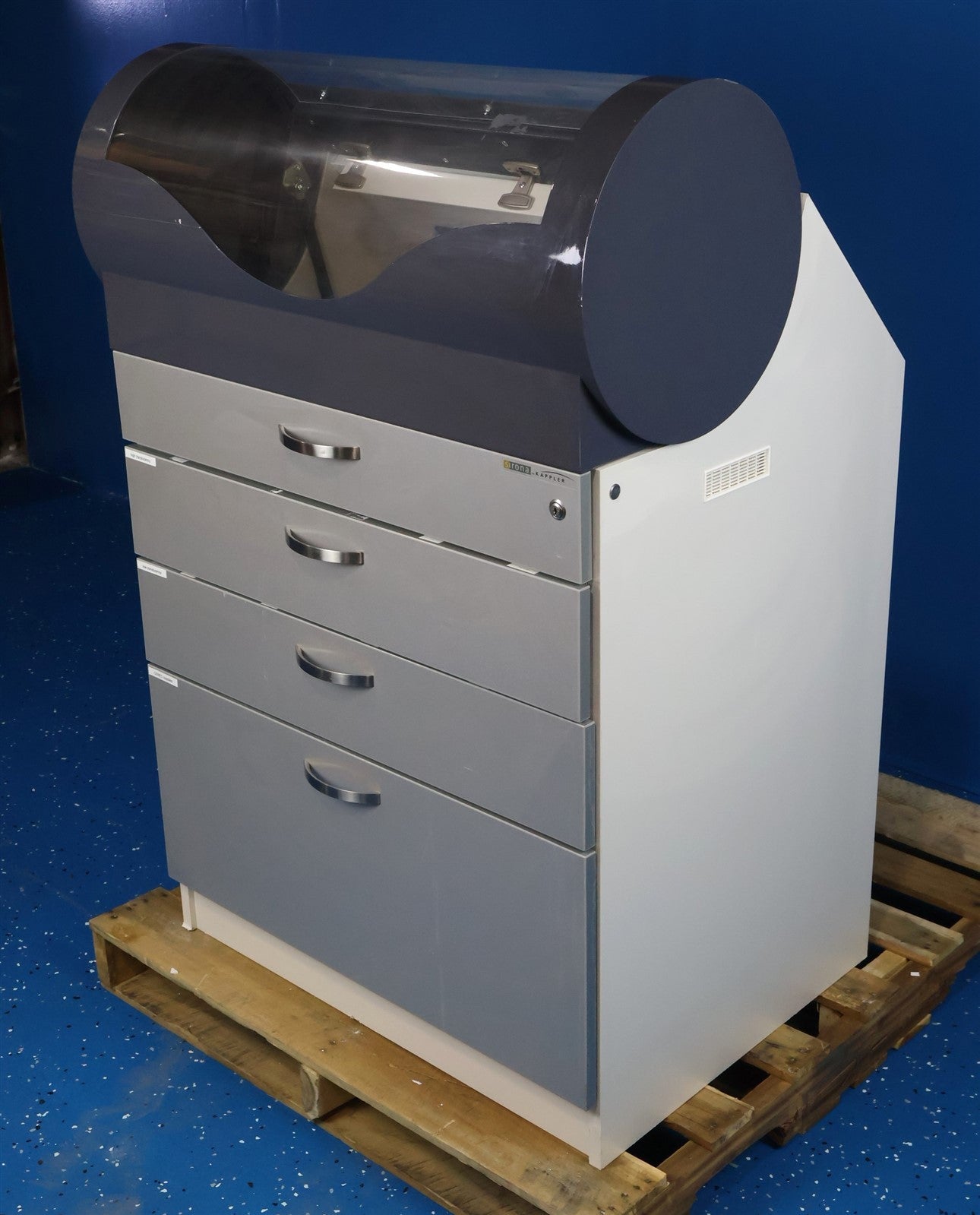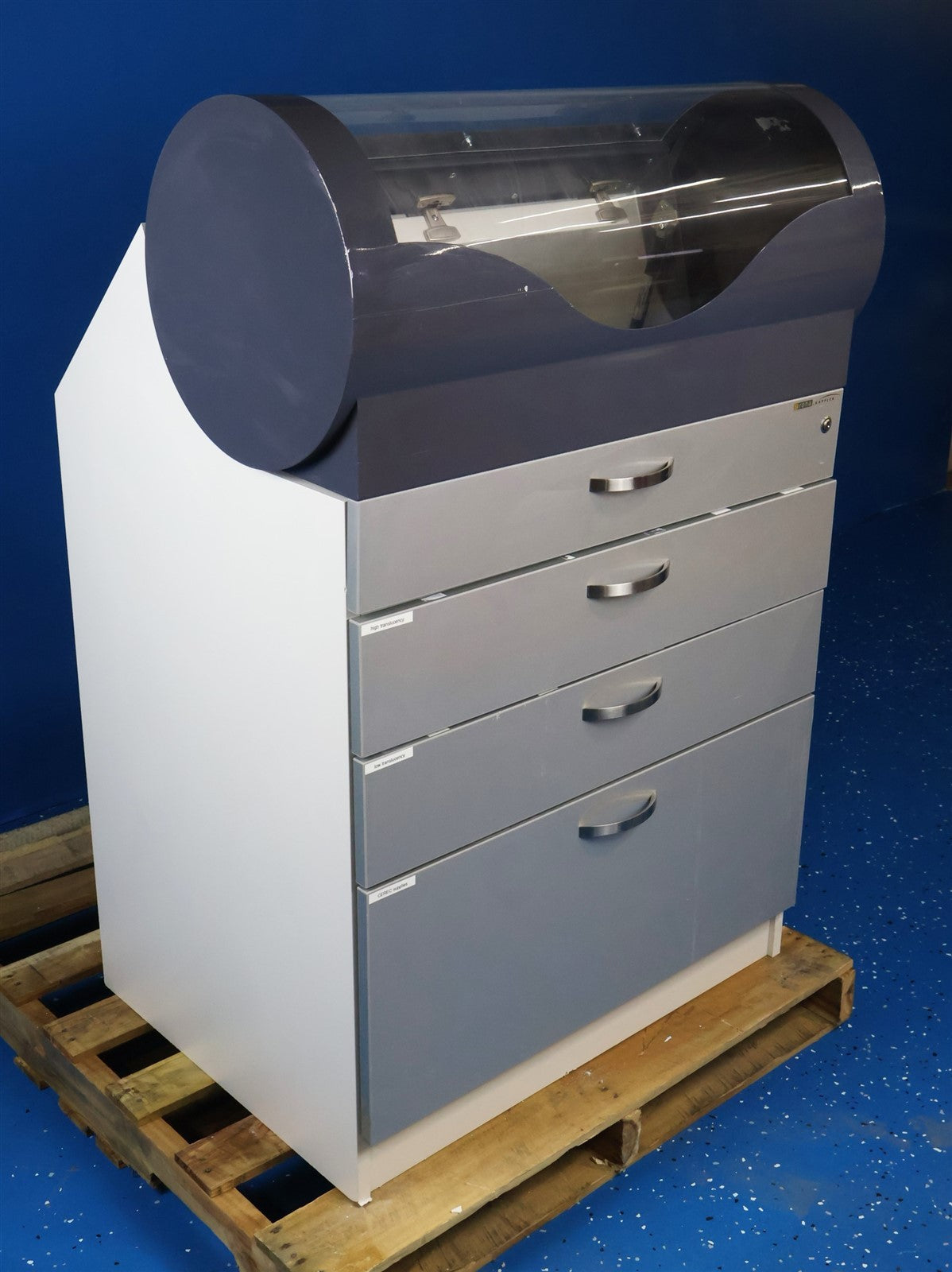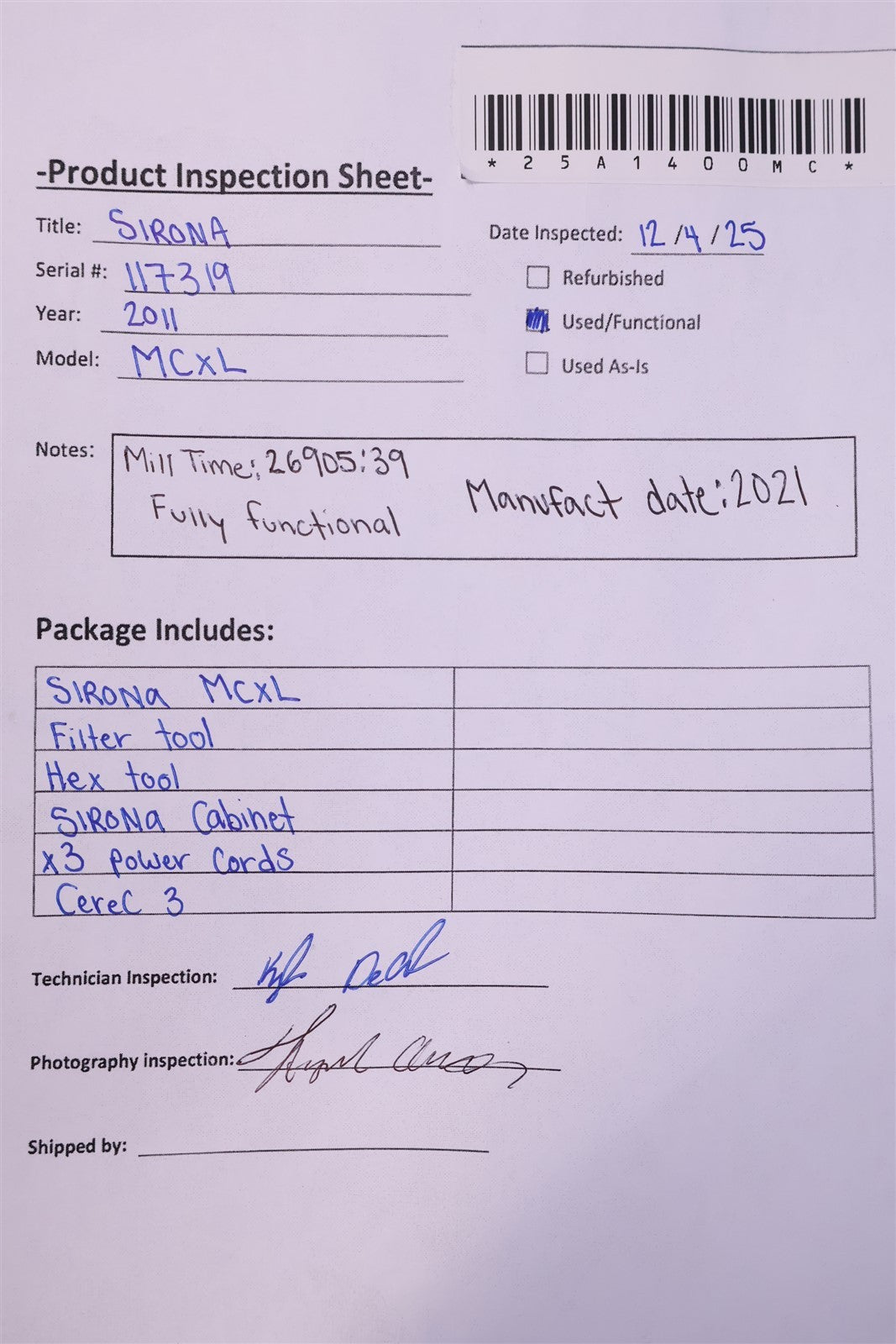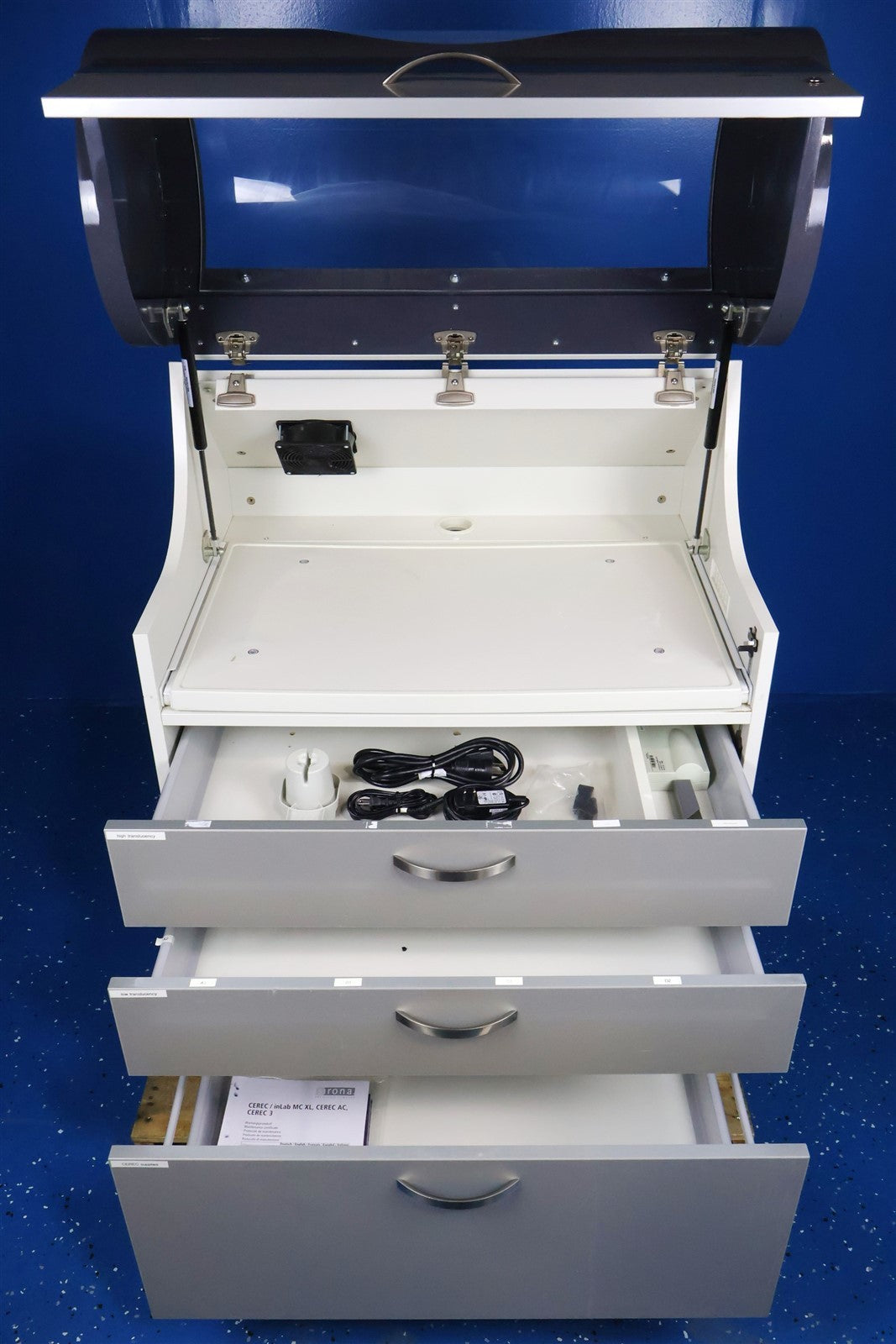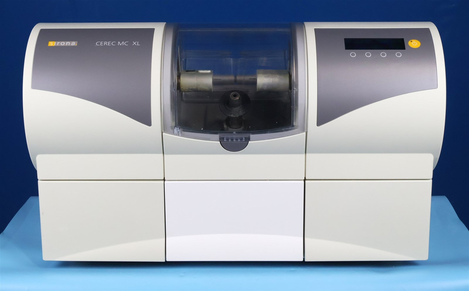 This Sirona MCXL with cabinet was visually inspected for any damage or missing components that would interfere with the units complete functionality. Unit has LIGHT cosmetic defects from PRIOR USE. Proceeded to test MCXL with an in house Cerec which has the software needed to calibrate and do a complete test procedure for all moving components.. MCXL paired up with no complications, powered on with a clear legible digital display. I then ran through all the different procedures for testing to ensure that unit responds and completes each test displaying passing colors. Unit successfully passed the service software for function testing with NO complications OR ERROR codes presented. Calibrated. CABINET HAS A HINGE WITH DAMAGE, DOES NOT HOLD UP RIGHT POSITION FOR LONG DURATION. MCXL FULLY FUNCTIONAL.