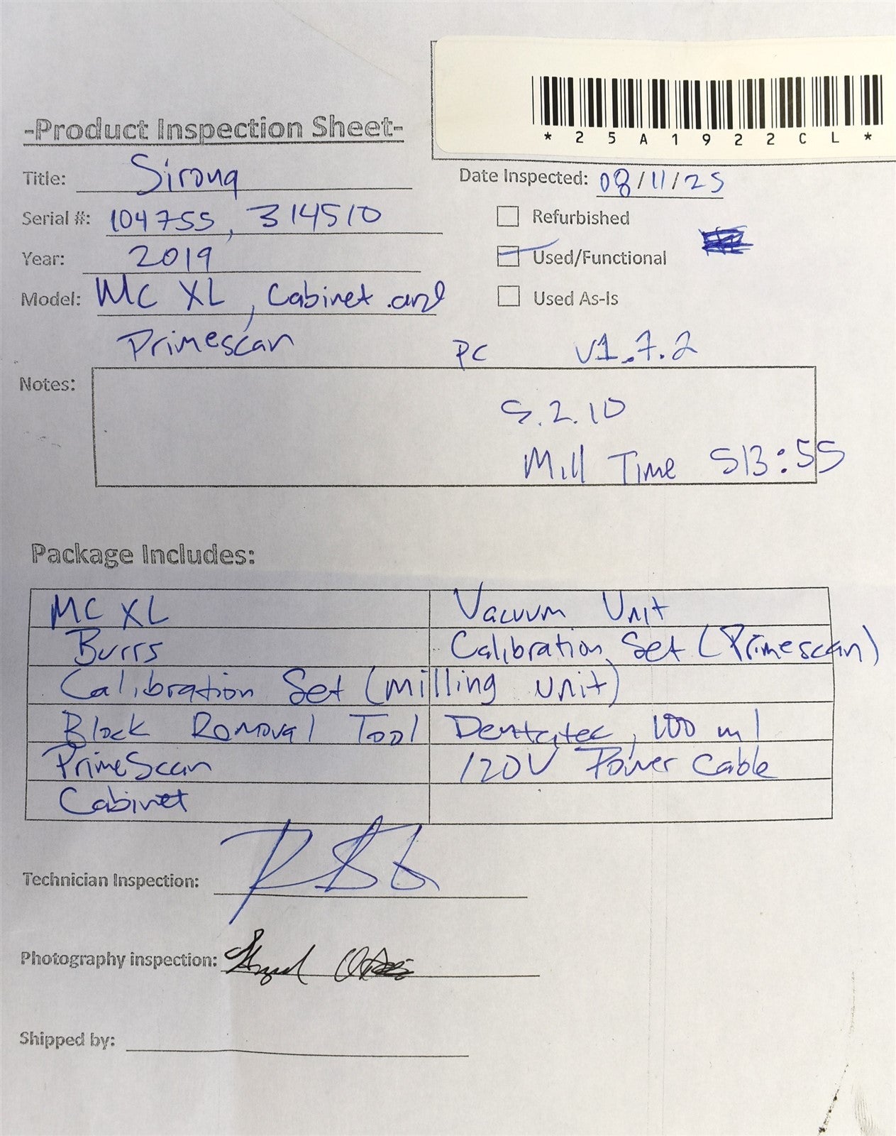 Atlas Resell Management has more experience testing and shipping CEREC and other CAD/CAM units than anyone else on eBay. Just check out the wide selection of CAD/CAM units in our store.We're proud to be the most trusted source for quality used CAD/CAM units in the pre-owned dental equipment market. Your purchase will NOT include: This product is pre-owned and may not include the same accessories as a new, unused unit. - other accessories not shown or listed here.Performed comprehensive functional tests on both the Primescan and the MX CL, with all systems confirmed to be fully operational. Successfully updated the software on the Primescan. Recorded mill runtime is 513 minutes and 55 seconds