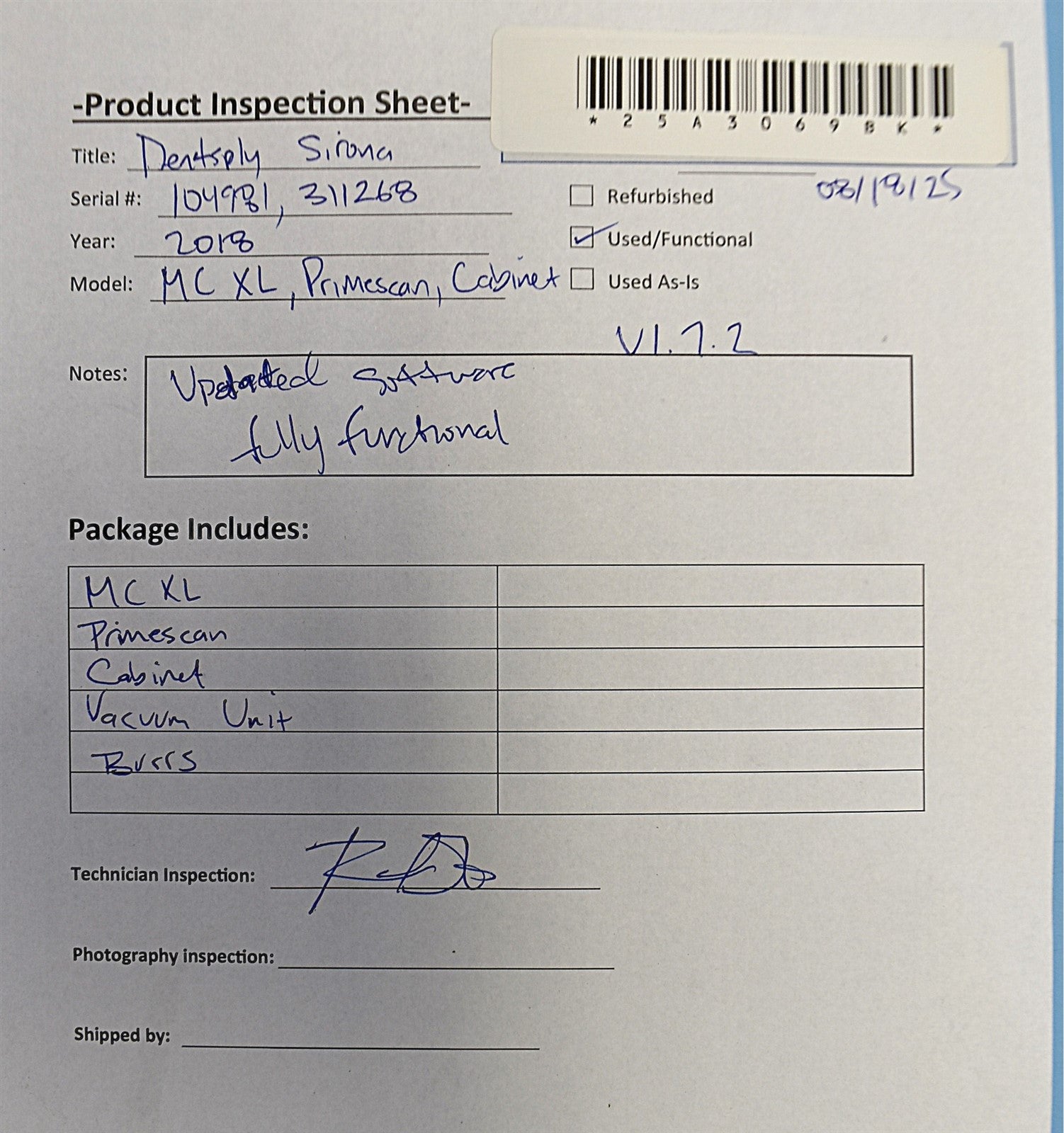 Performed a visual inspection of all units to identify any damaged or missing components or accessories. Calibrated the PrimeScan and verified full functionality through performance testing. The MC XL milling unit was successfully calibrated and passed all functional tests. The vacuum system was also tested and confirmed to be operating correctly. All units are fully functional and in good cosmetic condition overall. Mill Time: 16530 minutes Software Version: 5.2.10 Hardware Version: V1.7.2