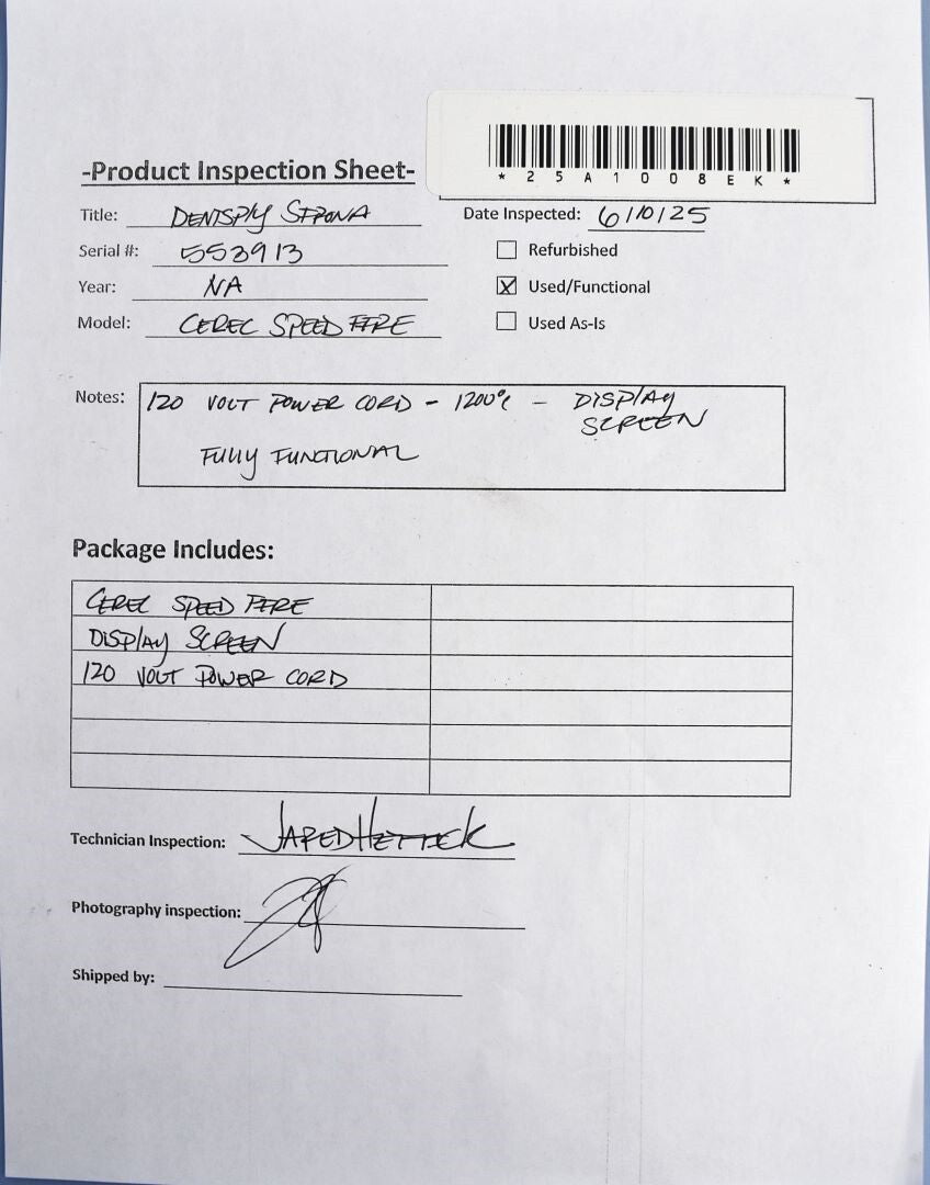 CEREC SPEEDFIRE, was inspected for physical damage, functionality, and safety. The exterior housing is intact with no visible cracks or dents. The door seal is in good condition with no sings of wear. The unit powered on successfully, and the control panel is fully functional. Ran temperature test: Pass. All controls are responsive. The unit has been cleaned and disinfected. Inspection Results: Passed- Ready for Resale