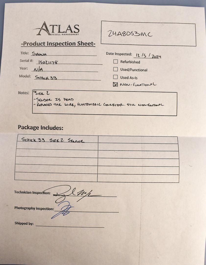 Your purchase will NOT include: manufacturer warranty, or any other accessories not shown or listed here.Visually inspected the unit for any damaged or missing parts and accessories. The cover on the back of the sensor head is missing. This may be a sign of an attempted repair on this unit. Attempted to function test the unit but the unit keeps connecting and disconnecting from the PC. Replaced the wire and elastomeric connector. Attempted to function test the unit. This sensor is non-functional. Dead sensor.