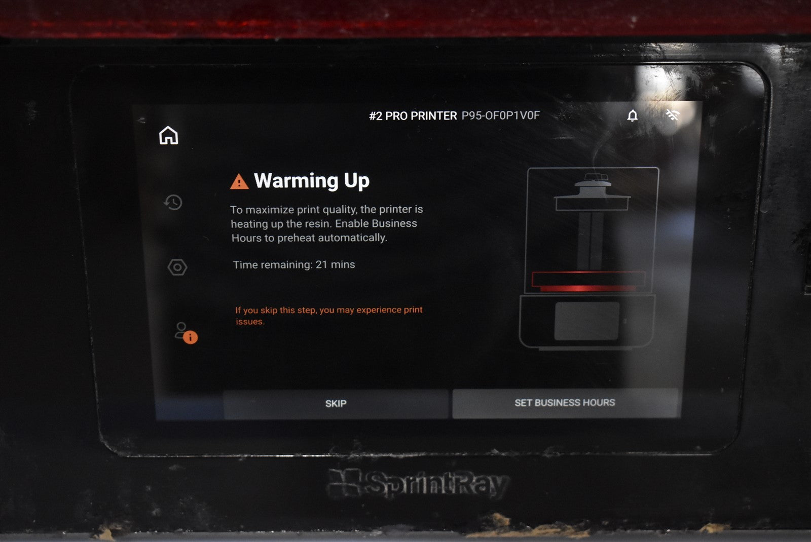 SprintRay was inspected for damage . SprintRay was plugged into a 120 volt outlet, powered on correctly. Warm up function was indicated. Checked display screen, no damage, ran through Home screen functions. Checked Software-8.0.5.22/Firmware-2.61.01. Disinfected and cleaned unit. Inspection Results:- Pass , Ready for resale.