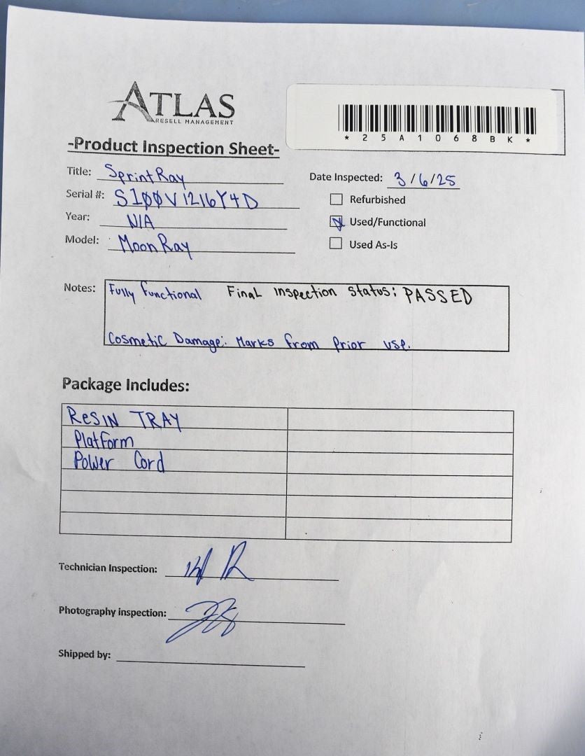 Prior to function testing unit, visually inspected to ensure damage free and complete. UNIT DOES NOT INCLUDE SOFTWARE OR ETHERNET CORD. This SprintRay MoonRay S is in GREAT condition. Including platfrom, Resin Tray, power cord, and a damage free top cover. This model is wireless and does not include any digital touch screen control display. Will require MoonRay software download off of app. Which instructions are within the box. Proceeded to attach to power (120V) as well as connecting to software on an IN HOUSE computer used for testing. Unit responds. OVERALL GREAT FULLY FUNTIONAL UNIT. FINAL INSPECTION STATUS: PASSED.