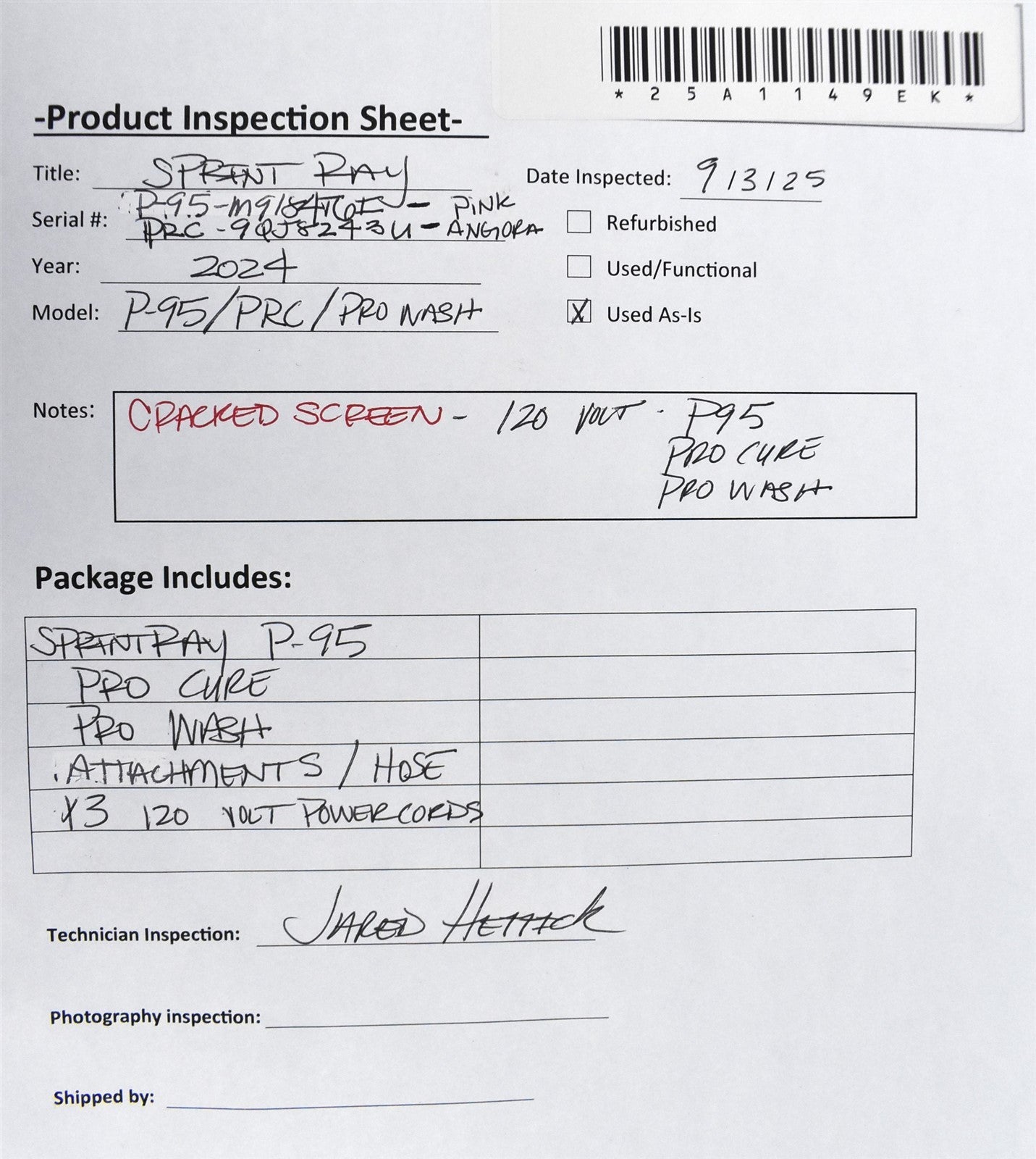 1 SprintRay Pro 95. 1 Pro Cure, 1 Pro Wash, x3 120 volt power cords.