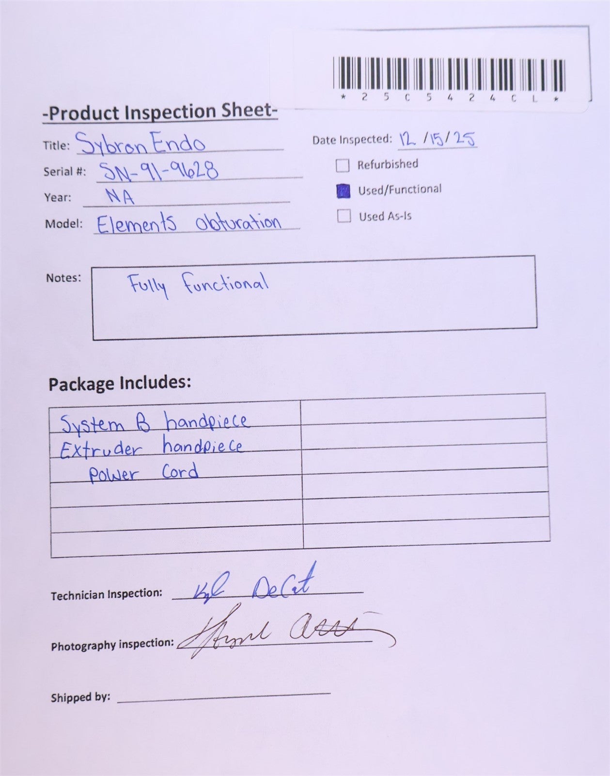 Prior to function testing this SybronEndo Elements Obturation unit, it was visually inspected for any damage or missing components that would interfere with units desired functionality. Unit is complete. Including system B handpiece, extruder handpiece, and power cord. Proceeded to properly set unit up, and power on. Units digital display illuminated a clear/legible screen. Controls to adjust settings respond when interacted with. Good cosmetic condition. FINAL PRODUCT INSPECTION STATUS= PASSED/FULLY FUNCTIONAL.