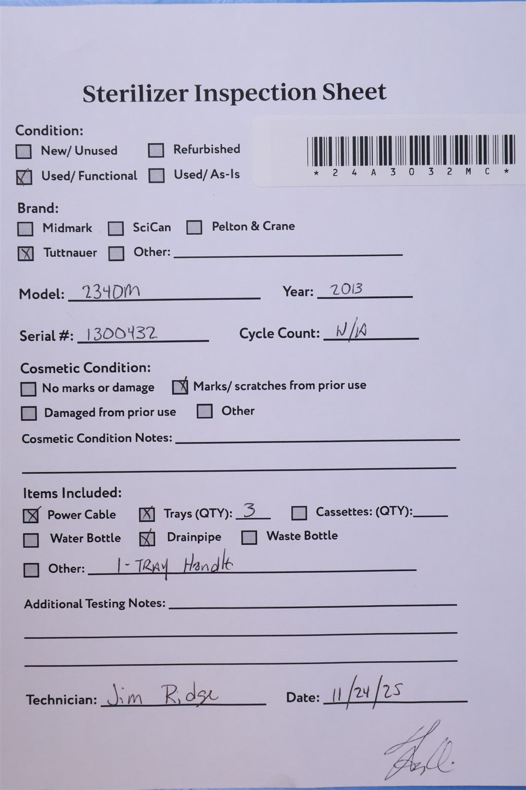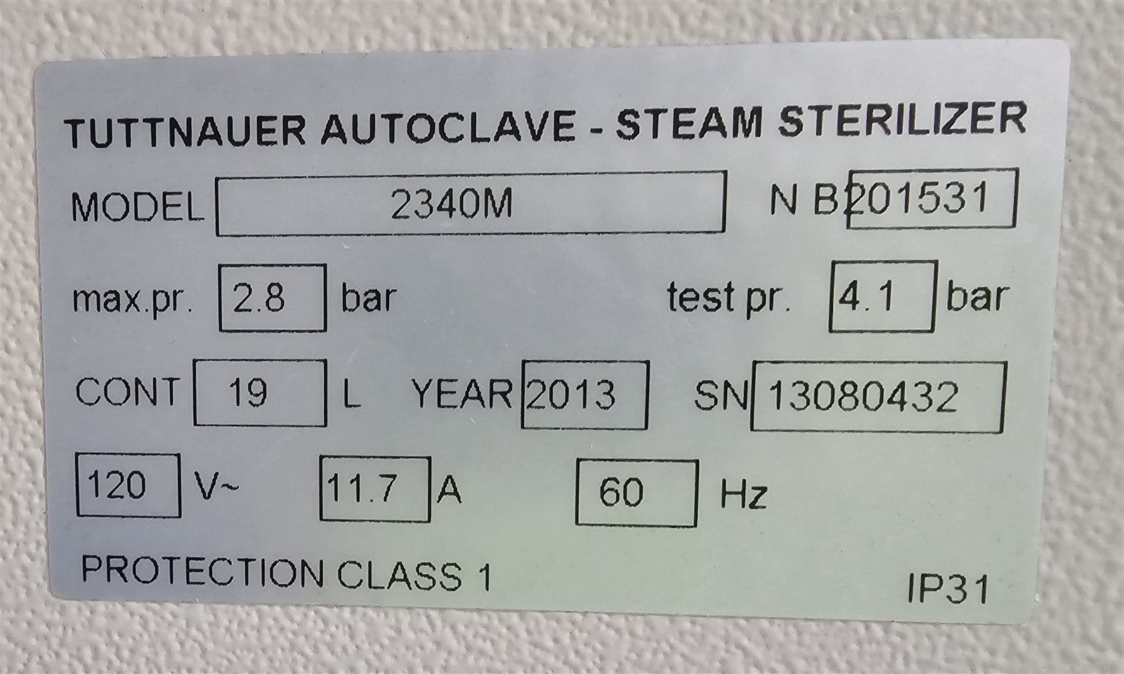 1 - Tuttnauer 2340M Manual Autoclave Steam Sterilizer 3 - Sterilizing Trays w/ Rack 1 - Tray Handle 1 - Drain Hose 1 - Power Cord
