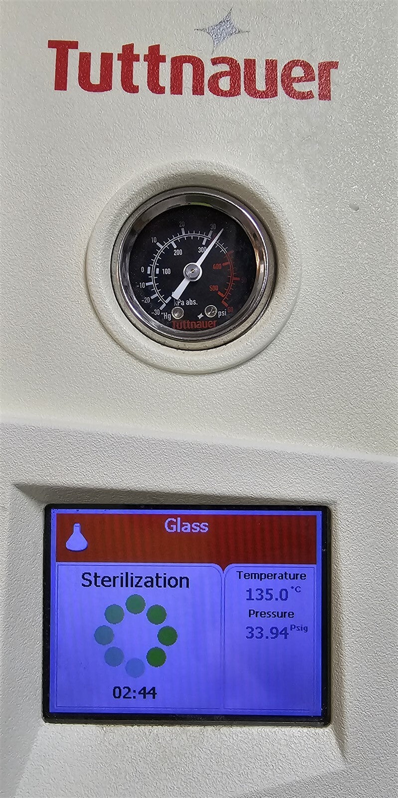 Inspected this autoclave internally and externally. Sterilizer is in good condition and includes one Sterilizing Tray, a sterilizing base, Rack and 230 Volt Power Cord. This Autoclave is a LABORATORY USE model designed to sterilize Glassware, Clothing, Bio-Waste and Liquids. To test this autoclave, it was connected to a 230 volt power source, distilled water was added and then test cycles were run. This autoclave was run through all it's preset sterilizing cycles several times. It was then temperature tested to verify that it is making its maximum required sterilizing temperature using a Max Register Thermometer and it was found to exceed 273 F during a cycle. This autoclave has a printer, but it wasn't tested due to a lack of proper printer paper