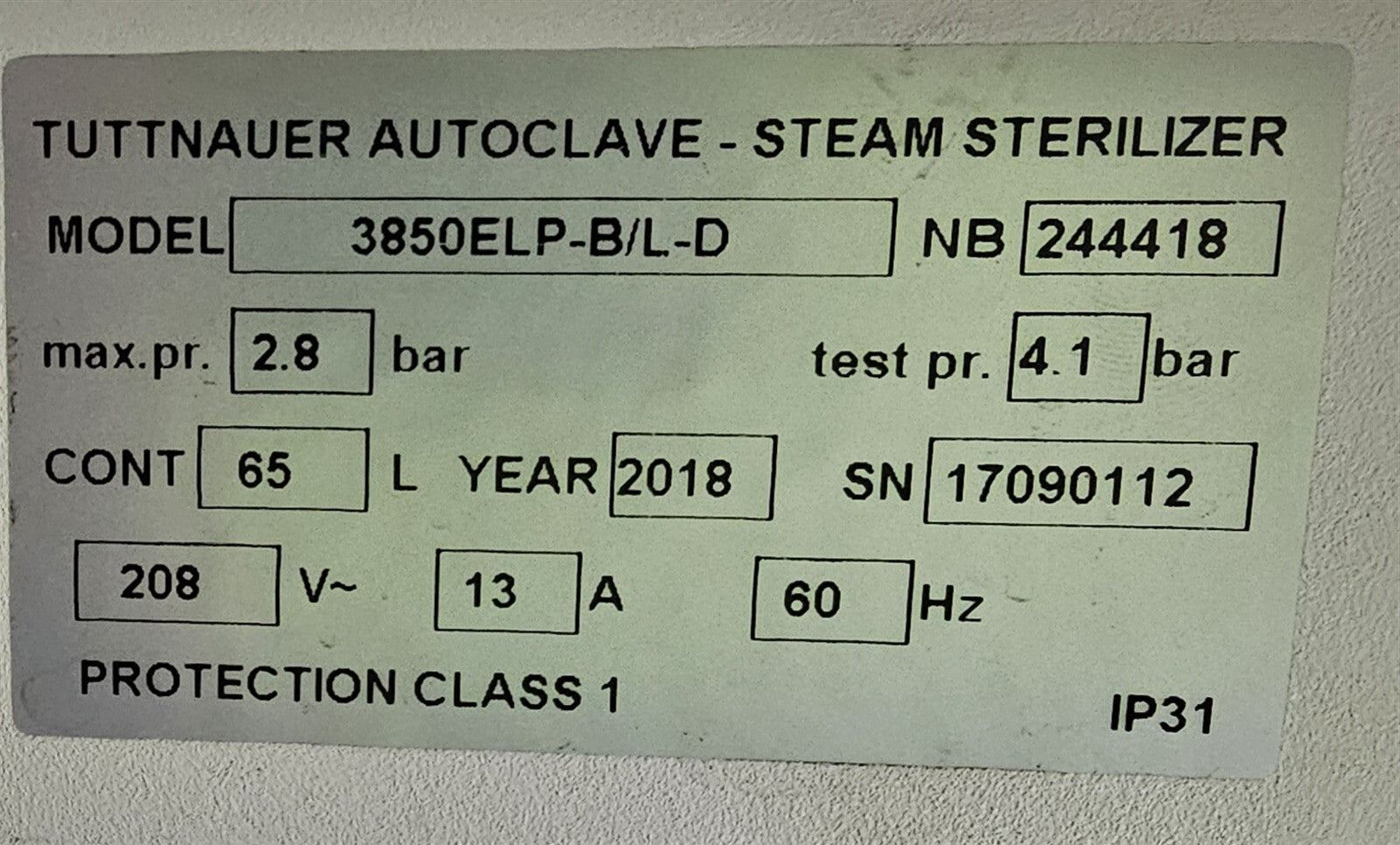 1 - Tuttnauer 3850ELP-B/L-D Labratory Sterilizer 1 - Sterilizing Tray w/ Rack 1 - Sterilizing Base 1 - 230 Volt power Cord