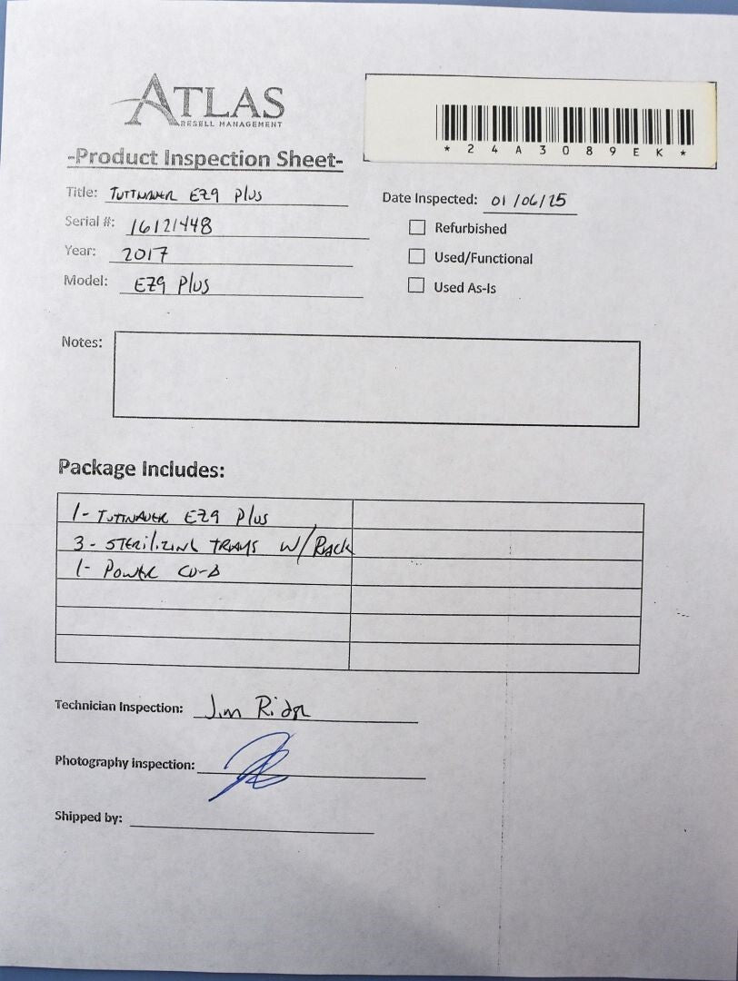 1 - Tuttnauer EZ9 PLUS Autoclave 3 - Sterilizing Trays w/ Rack 1 - Power Cord