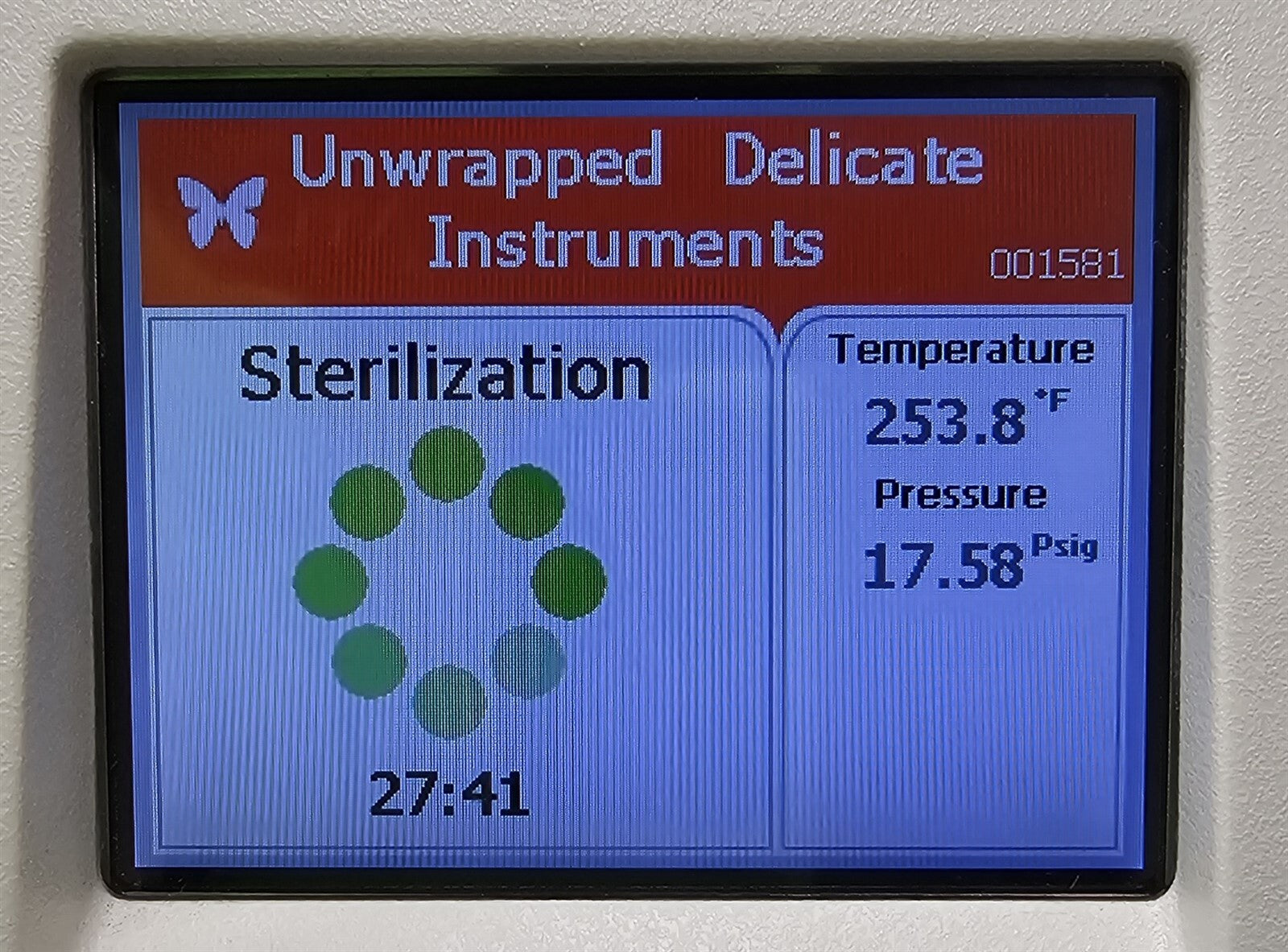 Prior to testing this autoclave, the Reservoir Tank was cleaned and flushed and a new Safety Valve was installed. Also a new Air Drying Filter and Cap were installed. Cleaned the sterilizing trays and rack. Before this autoclave was run through it's preset cycles, the pressure and temperature sensors were calibrated. Then to test this autoclave, it was connected to a 120 volt power source, distilled water was added, then it was run through all it's sterilizing and drying cycles several times. To ensure that this autoclave is achieving it's maximum required sterilizing temperature during a cycle, it was temperature tested using a Max Register Thermometer and found to exceed 273 F during a cycle.