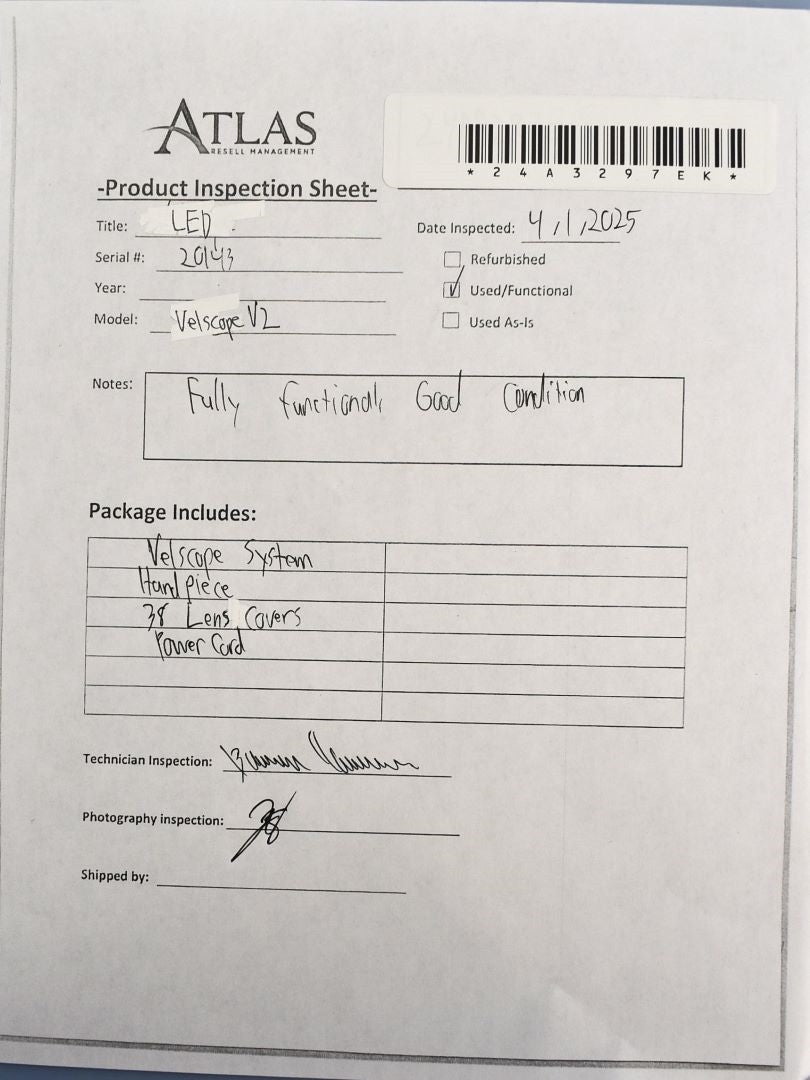The LED Velscope V2 was inspected for its LED light output. The handpiece projected light at an appropriate power level. The overall condition of this is great with some small stains on the surface of the control unit. Inspection Result: Passed - Ready for Resale