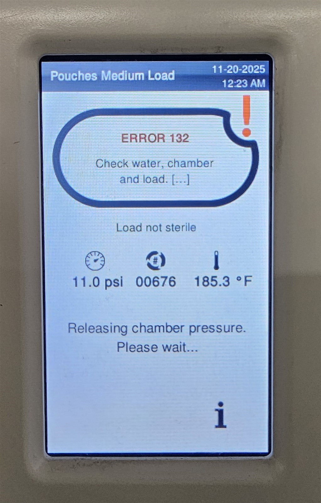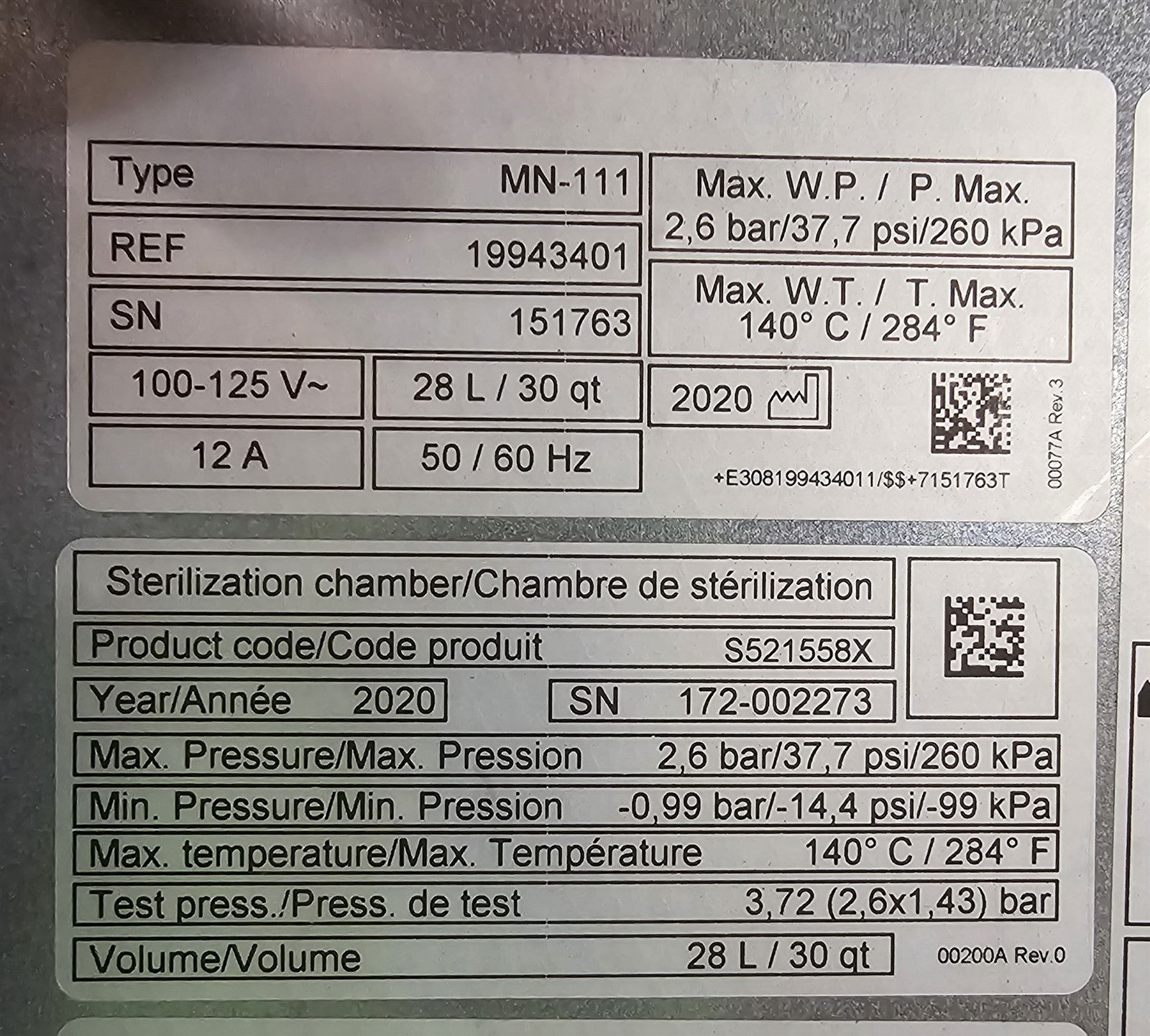 Visually inspected, this autoclave is in good cosmetic condition, and has all it's trays, rack and 120 volt power cord. Initial functionality testing found that this sterilizer has many issues that couldn't be resolved. This autoclave would start a cycle, but not complete one. The Error Code can be seen in the photographs. Lack of any available online maintenance manuals made it impossible to troubleshoot. It would require someone who has access to W&H technical training and service manuals to troubleshot and repair this autoclave.
