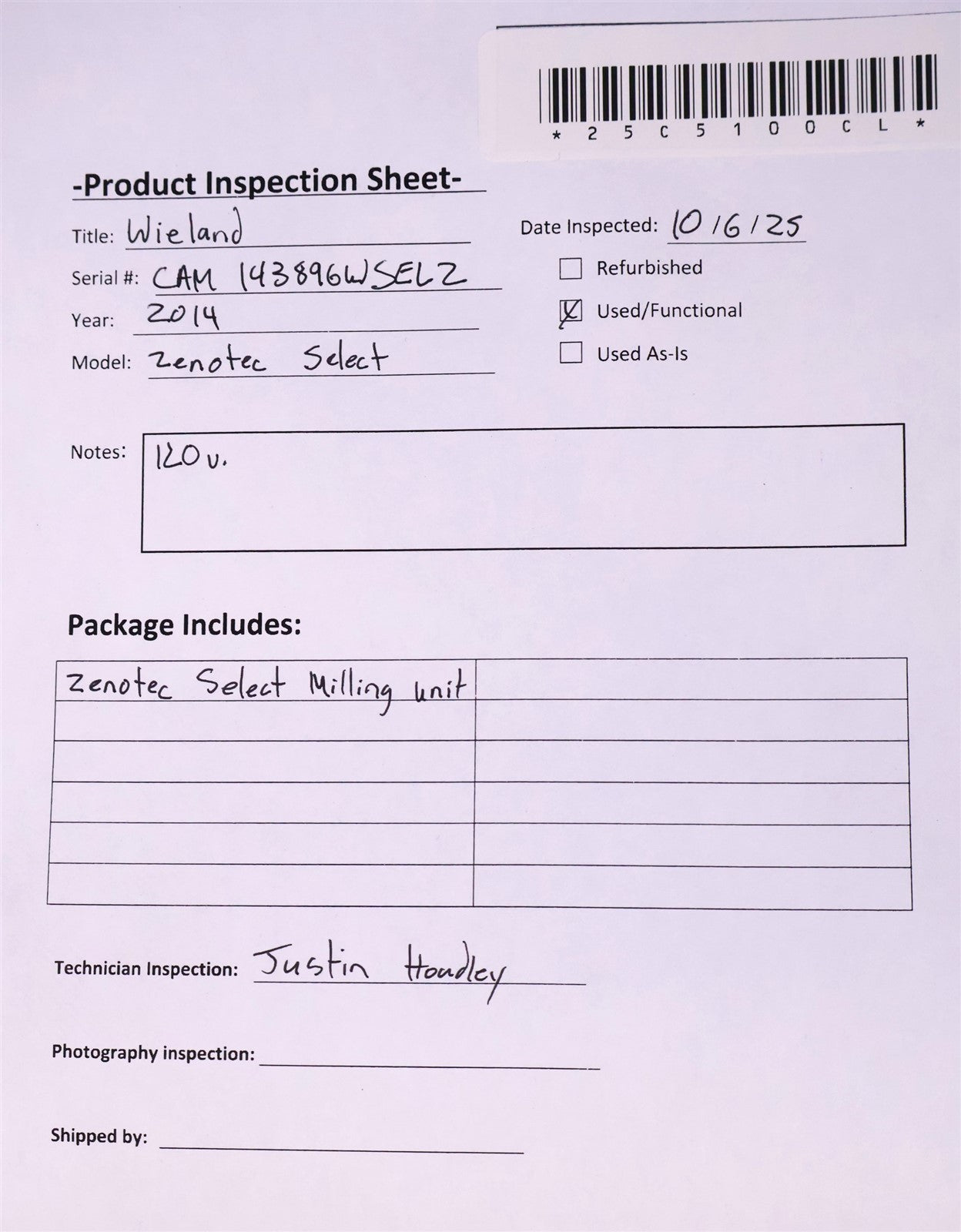 Wieland Zenotec Select Dental Milling Machine Unit for Cad/Cam Dentistry