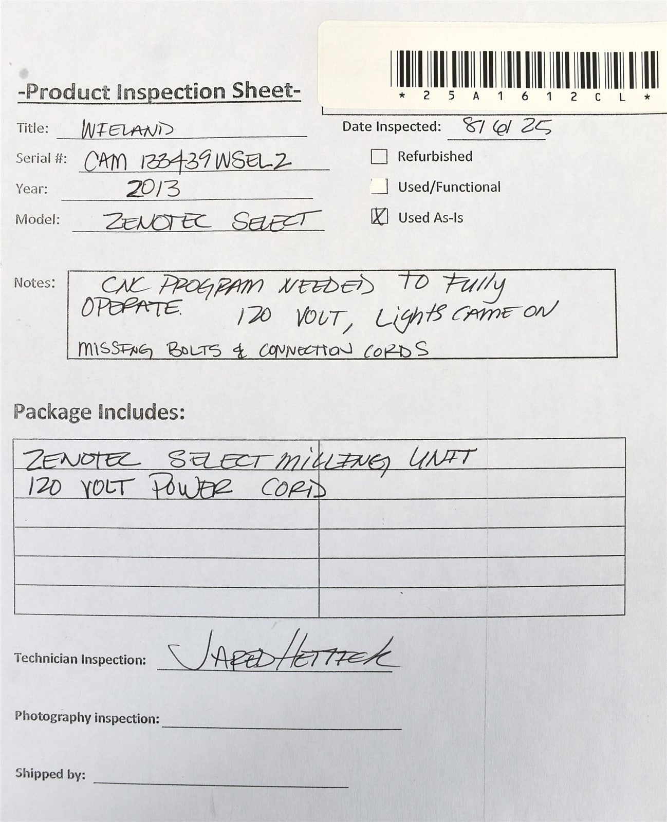 Check for wear on the spindle, tool changer, and material disc slots. Inspect water lines and air hoses for cracks or leaks. Inspect water lines and air hoses for cracks or leaks. Please note that a valid CNC software license is required to initiate and complete full unit testing procedures. The unit has been cleaned and disinfected. Inspection Resuly: - Ready for Resale