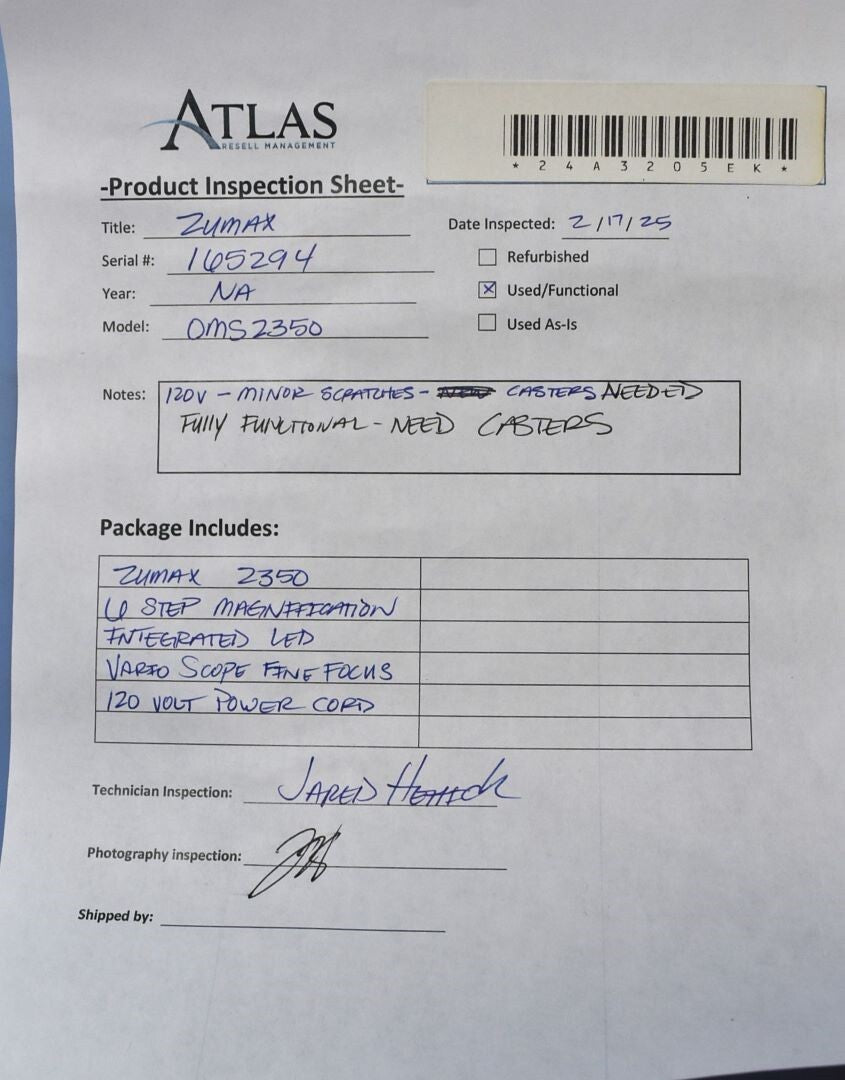 The Zumax was inspected for structural integrity, functionality, and condition. The frame is sturdy with no visible cracks or damage. All eletronic controls, including the preset positions and safety switches, function properly. Checked lenses for scratches and magnification. All Knobs functional, with no scratching or noise. The unit has been cleaned and disinfected. Inspection Resuly: - Ready for Resale.