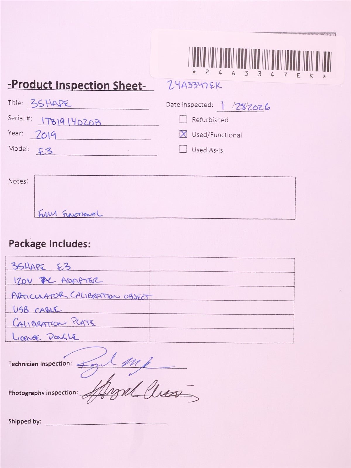 3Shape E3 Lab Scanner, 120v AC Adapter, Articulator Calibration Object, USB Cable, Calibration Parts, License Dongle