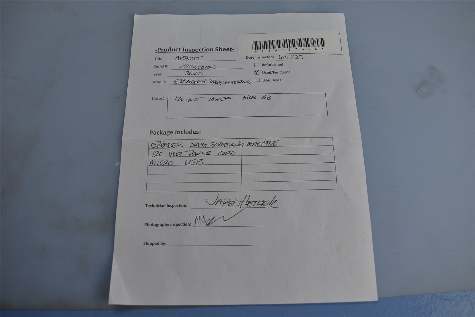 Abbott eReader+ drug Screening machine, 120 volt power cord, Micro USB cord.